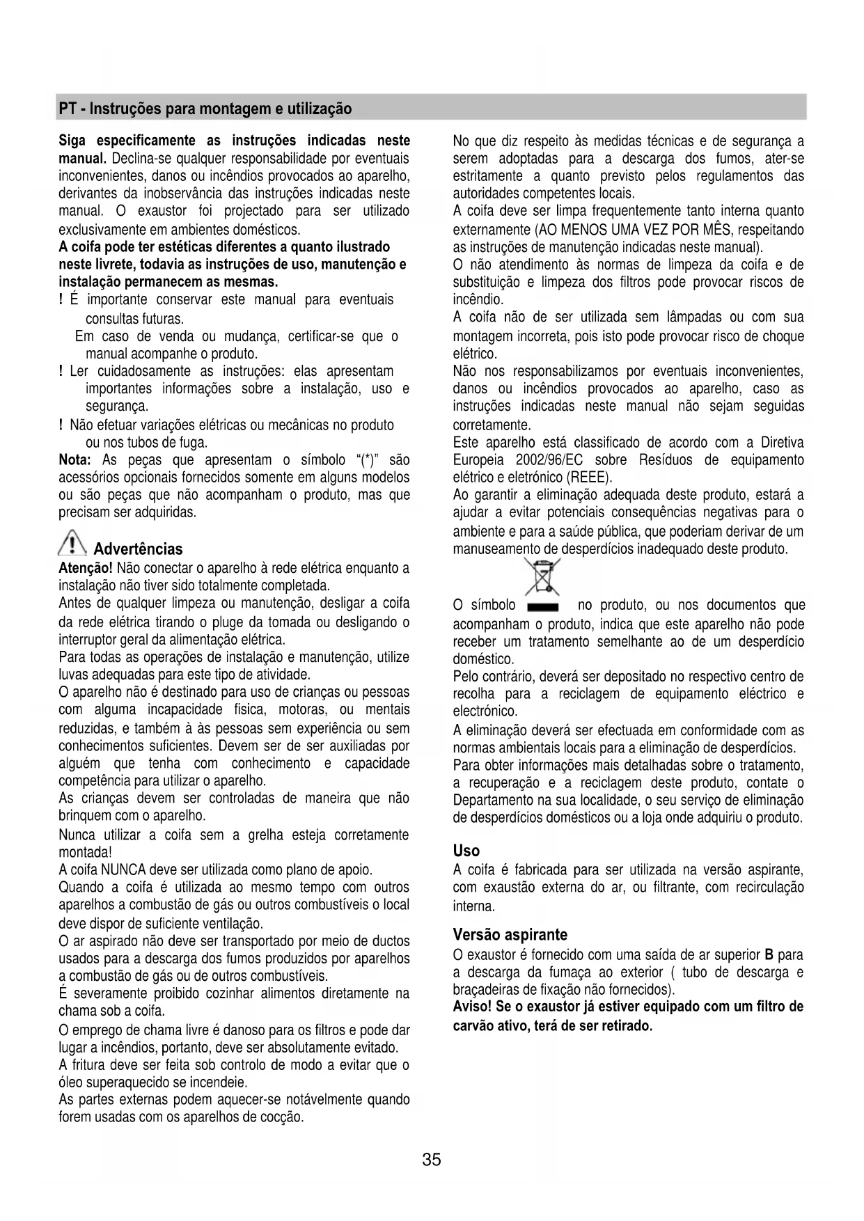 Если система подсветки не ра ботает, проверьте корректную установку ламп в гнездах, прежде чем обратиться в центр технической помощи.35 PT - Instruções para montagem e utilização Siga especificamente as instruções indicadas neste manual. Declina-se qualquer responsabilidade por eventuais inconvenientes, danos ou incêndios provocados ao aparelho, derivantes da inobservância das instruções indicadas neste manual. O exaustor foi projectado para ser utilizado exclusivamente em ambientes domésticos. A coifa pode ter estéticas diferentes a quanto ilustrado neste livrete, todavia as instruções de uso, manutenção e instalação permanecem as mesmas. ! É importante conservar este manual para eventuais consultas futuras. Em caso de venda ou mudança, certificar-se que o manual acompanhe o produto. ! Ler cuidadosamente as instruções: elas apresentam importantes informações sobre a instalação, uso e segurança. ! Não efetuar variações elétricas ou mecânicas no produto ou nos tubos de fuga. Nota: As peças que apresentam o símbolo “(*)” são acessórios opcionais fornecidos somente em alguns modelos ou são peças que não acompanham o produto, mas que precisam ser adquiridas. Advertências Atenção! Não conectar o aparelho à rede elétrica enquanto a instalação não tiver sido totalmente completada. Antes de qualquer limpeza ou manutenção, desligar a coifa da rede elétrica tirando o pluge da tomada ou desligando o interruptor geral da alimentação elétrica. Para todas as operações de instalação e manutenção, utilize luvas adequadas para este tipo de atividade. O aparelho não é destinado para uso de crianças ou pessoas com alguma incapacidade fisica, motoras, ou mentais reduzidas, e também à às pessoas sem experiência ou sem conhecimentos suficientes. Devem ser de ser auxiliadas por alguém que tenha com conhecimento e capacidade competência para utilizar o aparelho. As crianças devem ser controladas de maneira que não brinquem com o aparelho. Nunca utilizar a coifa sem a grelha esteja corretamente montada! A coifa NUNCA deve ser utilizada como plano de apoio. Quando a coifa é utilizada ao mesmo tempo com outros aparelhos a combustão de gás ou outros combustíveis o local deve dispor de suficiente ventilação. O ar aspirado não deve ser transportado por meio de ductos usados para a descarga dos fumos produzidos por aparelhos a combustão de gás ou de outros combustíveis. É severamente proibido cozinhar alimentos diretamente na chama sob a coifa. O emprego de chama livre é danoso para os filtros e pode dar lugar a incêndios, portanto, deve ser absolutamente evitado. A fritura deve ser feita sob controlo de modo a evitar que o óleo superaquecido se incendeie. As partes externas podem aquecer-se notávelmente quando forem usadas com os aparelhos de cocção. No que diz respeito às medidas técnicas e de segurança a serem adoptadas para a descarga dos fumos, ater-se estritamente a quanto previsto pelos regulamentos das autoridades competentes locais. A coifa deve ser limpa frequentemente tanto interna quanto externamente (AO MENOS UMA VEZ POR MÊS, respeitando as instruções de manutenção indicadas neste manual). O não atendimento às normas de limpeza da coifa e de substituição e limpeza dos filtros pode provocar riscos de incêndio. A coifa não de ser utilizada sem lâmpadas ou com sua montagem incorreta, pois isto pode provocar risco de choque elétrico. Não nos responsabilizamos por eventuais inconvenientes, danos ou incêndios provocados ao aparelho, caso as instruções indicadas neste manual não sejam seguidas corretamente. Este aparelho está classificado de acordo com a Diretiva Europeia 2002/96/EC sobre Resíduos de equipamento elétrico e eletrónico (REEE). Ao garantir a eliminação adequada deste produto, estará a ajudar a evitar potenciais consequências negativas para o ambiente e para a saúde pública, que poderiam derivar de um manuseamento de desperdícios inadequado deste produto. O símbolo no produto, ou nos documentos que acompanham o produto, indica que este aparelho não pode receber um tratamento semelhante ao de um desperdício doméstico. Pelo contrário, deverá ser depositado no respectivo centro de recolha para a reciclagem de equipamento eléctrico e electrónico. A eliminação deverá ser efectuada em conformidade com as normas ambientais locais para a eliminação de desperdícios. Para obter informações mais detalhadas sobre o tratamento, a recuperação e a reciclagem deste produto, contate o Departamento na sua localidade, o seu serviço de eliminação de desperdícios domésticos ou a loja onde adquiriu o produto. Uso A coifa é fabricada para ser utilizada na versão aspirante, com exaustão externa do ar, ou filtrante, com recirculação interna. Versão aspirante O exaustor é fornecido com uma saída de ar superior B para a descarga da fumaça ao exterior ( tubo de descarga e braçadeiras de fixação não fornecidos). Aviso! Se o exaustor já estiver equipado com um filtro de carvão ativo, terá de ser retirado.36 Versão filtrante Se não for possível descarregar a fumaça e os vapores de cozimento para o exterior, o exaustor poderá ser utilizado na versão filtrante, desde que se monte um filtro de carvão ativo e o deflector F do suporte G. Nesta configuração, a fumaça e os vapores são reciclados passando pela grade superior H através de um tubo de descarga ligado à saída superior de ar B e do anel de conexão montado no deflector F (o tubo de descarga e as braçadeiras de fixação não são fornecidos). Aviso! Se o exaustor não estiver equipado com um filtro de carvão, terá de ser encomendado e colocado. Os modelos sem motor de aspiração funcionam exclusivamente na versão aspirante e devem ser ligados a uma unidade periférica de aspiração (nã