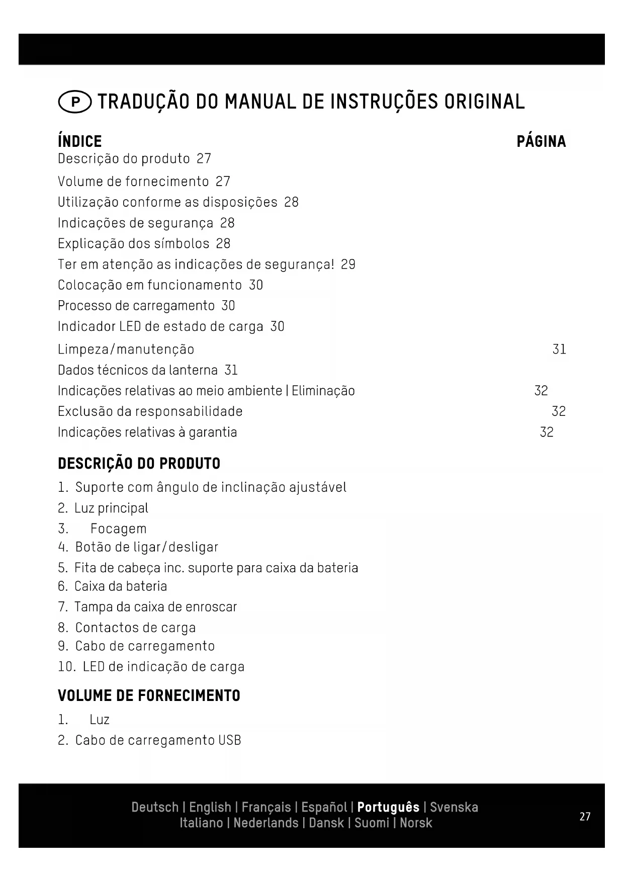 Descrição do produto 27 Volume de fornecimento 27 Utilização conforme as disposições 28 Indicações de segurança 28 Explicação dos símbolos 28 Ter em atenção as indicações de segurança! 29 Colocação em funcionamento 30 Processo de carregamento 30 Indicador LED de estado de carga 30 Limpeza/manutenção 31 Dados técnicos da lanterna 31 Indicações relativas ao meio ambiente | Eliminação 32 Exclusão da responsabilidade 32 Indicações relativas à garantia 32 Deutsch | English | Français | Español | Português | Svenska Italiano | Nederlands | Dansk | Suomi | Norsk28