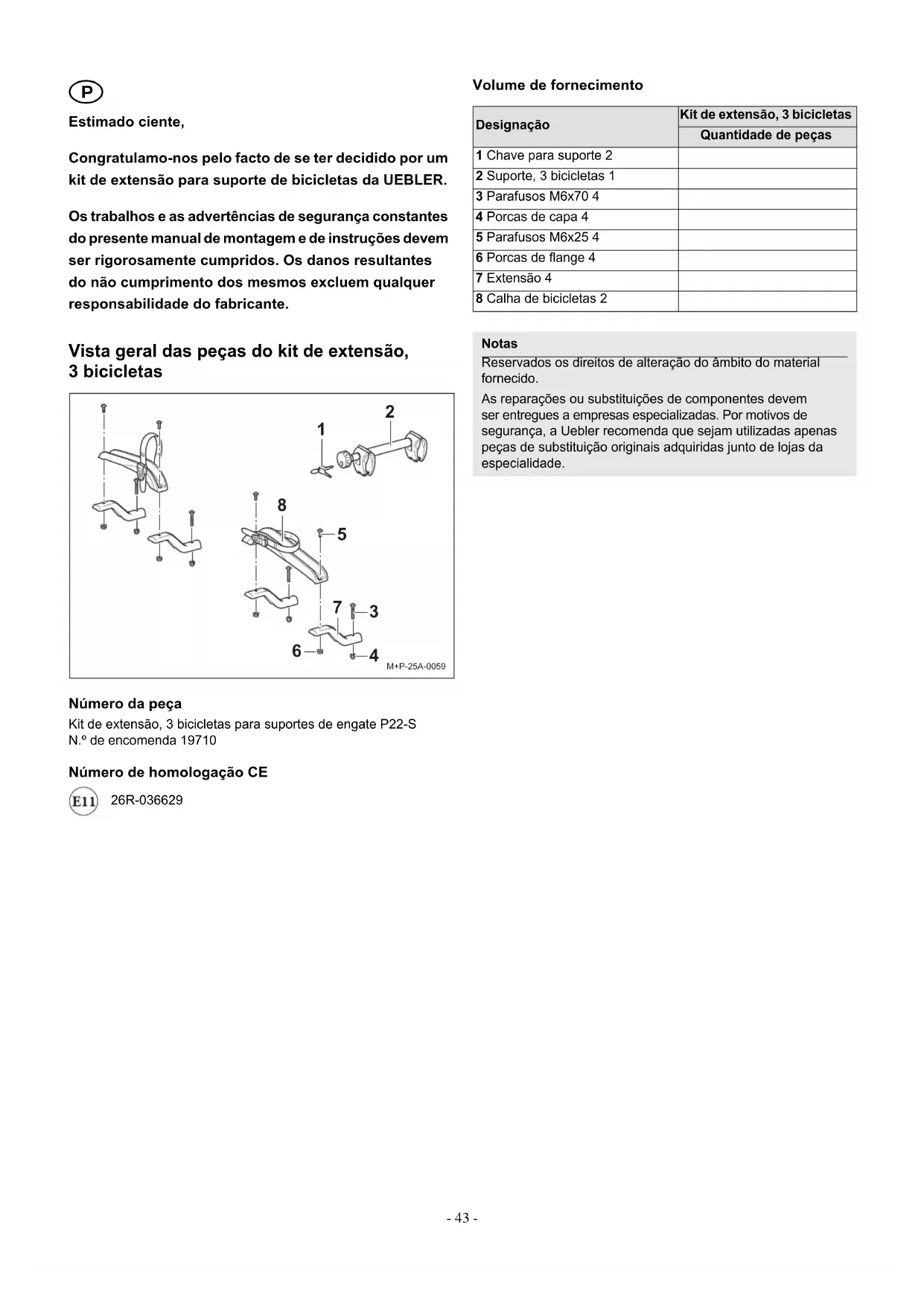 Estimado ciente, Congratulamo-nos pelo facto de se ter decidido por um kit de extensão para suporte de bicicletas da UEBLER. Os trabalhos e as advertências de segurança constantes do presente manual de montagem e de instruções devem ser rigorosamente cumpridos. Os danos resultantes do não cumprimento dos mesmos excluem qualquer responsabilidade do fabricante. Vista geral das peças do kit de extensão, 3 bicicletas Número da peça Kit de extensão, 3 bicicletas para suportes de engate P22-S N.º de encomenda 19710 Número de homologação CE 26R-036629 Volume de fornecimento