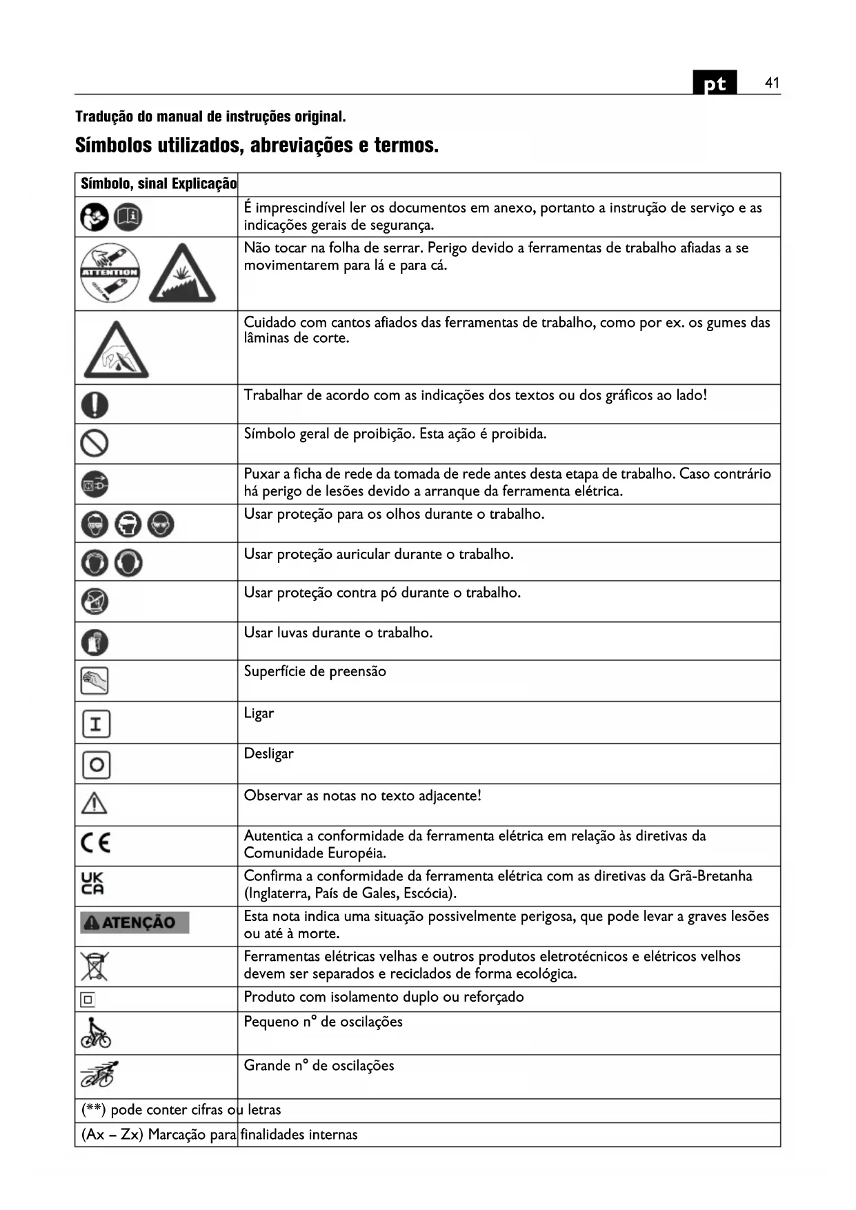 Tradução do manual de instruções original. Símbolos utilizados, abreviações e termos. Símbolo, sinal Explicação É imprescindível ler os documentos em anexo, portanto a instrução de serviço e as indicações gerais de segurança. Não tocar na folha de serrar. Perigo devido a ferramentas de trabalho afiadas a se movimentarem para lá e para cá. Cuidado com cantos afiados das ferramentas de trabalho, como por ex. os gumes das lâminas de corte. Trabalhar de acordo com as indicações dos textos ou dos gráficos ao lado! Símbolo geral de proibição. Esta ação é proibida. Puxar a ficha de rede da tomada de rede antes desta etapa de trabalho. Caso contrário há perigo de lesões devido a arranque da ferramenta elétrica. Usar proteção para os olhos durante o trabalho. Usar proteção auricular durante o trabalho. Usar proteção contra pó durante o trabalho. Usar luvas durante o trabalho. Superfície de preensão Ligar Desligar Observar as notas no texto adjacente! Autentica a conformidade da ferramenta elétrica em relação às diretivas da Comunidade Européia. Confirma a conformidade da ferramenta elétrica com as diretivas da Grã-Bretanha (Inglaterra, País de Gales, Escócia). Esta nota indica uma situação possivelmente perigosa, que pode levar a graves lesões ou até à morte. Ferramentas elétricas velhas e outros produtos eletrotécnicos e elétricos velhos devem ser separados e reciclados de forma ecológica. Produto com isolamento duplo ou reforçado Pequeno n° de oscilações Grande n° de oscilações (**) pode conter cifras ou letras (Ax – Zx) Marcação para finalidades internas42