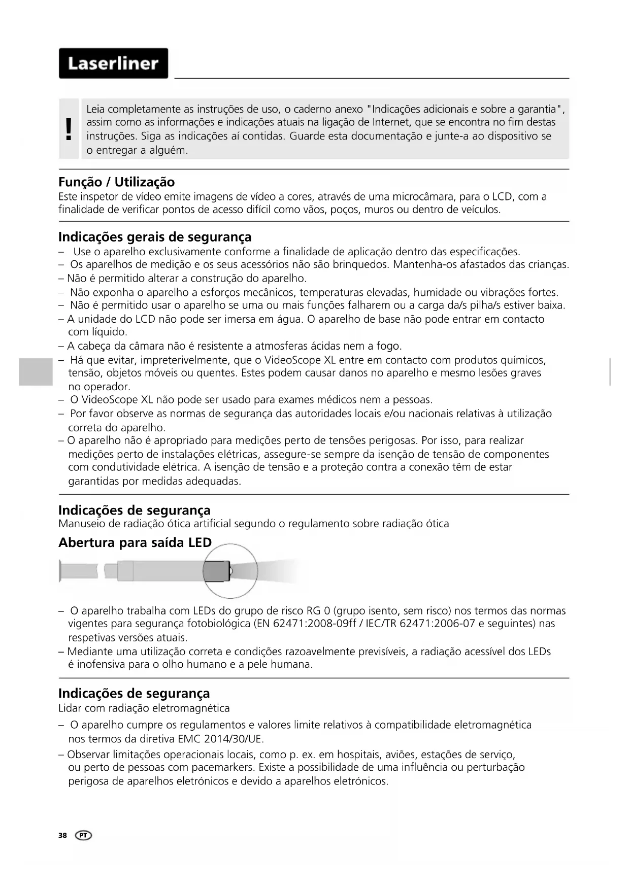 Indicações gerais de segurança – Use o aparelho exclusivamente conforme a nalidade de aplicação dentro das especicações. – Os aparelhos de medição e os seus acessórios não são brinquedos. Mantenha-os afastados das crianças. – Não é permitido alterar a construção do aparelho. – Não exponha o aparelho a esforços mecânicos, temperaturas elevadas, humidade ou vibrações fortes. – Não é permitido usar o aparelho se uma ou mais funções falharem ou a carga da/s pilha/s estiver baixa. – A unidade do LCD não pode ser imersa em água. O aparelho de base não pode entrar em contacto com líquido. – A cabeça da câmara não é resistente a atmosferas ácidas nem a fogo. – Há que evitar, impreterivelmente, que o VideoScope XL entre em contacto com produtos químicos, tensão, objetos móveis ou quentes. Estes podem causar danos no aparelho e mesmo lesões graves no operador. – O VideoScope XL não pode ser usado para exames médicos nem a pessoas. – Por favor observe as normas de segurança das autoridades locais e/ou nacionais relativas à utilização correta do aparelho. – O aparelho não é apropriado para medições perto de tensões perigosas. Por isso, para realizar medições perto de instalações elétricas, assegure-se sempre da isenção de tensão de componentes com condutividade elétrica. A isenção de tensão e a proteção contra a conexão têm de estar garantidas por medidas adequadas. – O aparelho trabalha com LEDs do grupo de risco RG 0 (grupo isento, sem risco) nos termos das normas vigentes para segurança fotobiológica (EN 62471:2008-09ff / IEC/TR 62471:2006-07 e seguintes) nas respetivas versões atuais. – Mediante uma utilização correta e condições razoavelmente previsíveis, a radiação acessível dos LEDs é inofensiva para o olho humano e a pele humana. Indicações de segurança Lidar com radiação eletromagnética – O aparelho cumpre os regulamentos e valores limite relativos à compatibilidade eletromagnética nos termos da diretiva EMC 2014/30/UE. – Observar limitações operacionais locais, como p. ex. em hospitais, aviões, estações de serviço, ou perto de pessoas com pacemarkers. Existe a possibilidade de uma inuência ou perturbação perigosa de aparelhos eletrónicos e devido a aparelhos eletrónicos. Indicações de segurança Manuseio de radiação ótica artificial segundo o regulamento sobre radiação ótica Abertura para saída LED