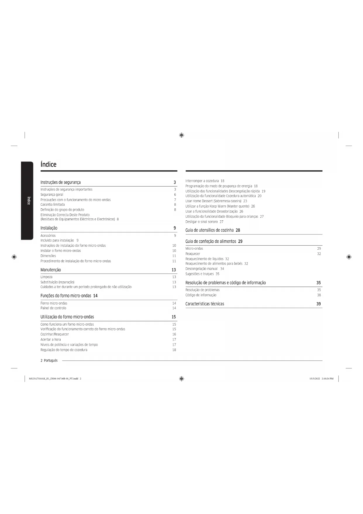 - (opłata według taryfy operatora) http://www.samsung.com/pl/support/ DE68-04716B-00 MS23A7318AK_E1_DE68-04716B-00_ES.indd 44MS23A7318AK_E1_DE68-04716B-00_ES.indd 44 15/3/2022 2:07:42 PM15/3/2022 2:07:42 PMForno micro-ondas Manual do utilizador MS23A7318A* MS23A7318AK_E1_DE68-04716B-00_PT.indd 1MS23A7318AK_E1_DE68-04716B-00_PT.indd 1 15/3/2022 2:10:24 PM15/3/2022 2:10:24 PM2 Português Índice 2 Português Interromper a cozedura 18 Programação do modo de poupança de energia 18 Utilização das funcionalidades Descongelação rápida 19 Utilização da funcionalidade Cozedura automática 20 Usar Home Dessert (Sobremesa caseira) 23 Utilizar a função Keep Warm (Manter quente) 26 Usar a funcionalidade Desodorização 26 Utilização da funcionalidade Bloqueio para crianças 27 Desligar o sinal sonoro 27 Guia de utensílios de cozinha 28 Guia de confeção de alimentos 29 Micro-ondas 29 Reaquecer 32 Reaquecimento de líquidos 32 Reaquecimento de alimentos para bebés 32 Descongelação manual 34 Sugestões e truques 35 Resolução de problemas e código de informação 35 Resolução de problemas 35 Código de informação 38 Características técnicas 39 Índice Instruções de segurança 3 Instruções de segurança importantes 3 Segurança geral 6 Precauções com o funcionamento do micro-ondas 7 Garantia limitada 8 Denição do grupo do produto 8 Eliminação Correcta Deste Produto (Resíduos de Equipamentos Eléctricos e Electrónicos) 8 Instalação 9 Acessórios 9 Incluído para instalação 9 Instruções de instalação do forno micro-ondas 10 Instalar o forno micro-ondas 10 Dimensões 11 Procedimento de instalação do forno micro-ondas 11 Manutenção 13 Limpeza 13 Substituição (reparação) 13 Cuidados a ter durante um período prolongado de não utilização 13 Funções do forno micro-ondas 14 Forno micro-ondas 14 Painel de controlo 14 Utilização do forno micro-ondas 15 Como funciona um forno micro-ondas 15 Vericação do funcionamento correto do forno micro-ondas 15 Cozinhar/Reaquecer 16 Acertar a hora 17 Níveis de potência e variações de tempo 17 Regulação do tempo de cozedura 18 MS23A7318AK_E1_DE68-04716B-00_PT.indd 2MS23A7318AK_E1_DE68-04716B-00_PT.indd 2 15/3/2022 2:10:24 PM15/3/2022 2:10:24 PMPortuguês 3 Instruções de segurança Instruções de segurança