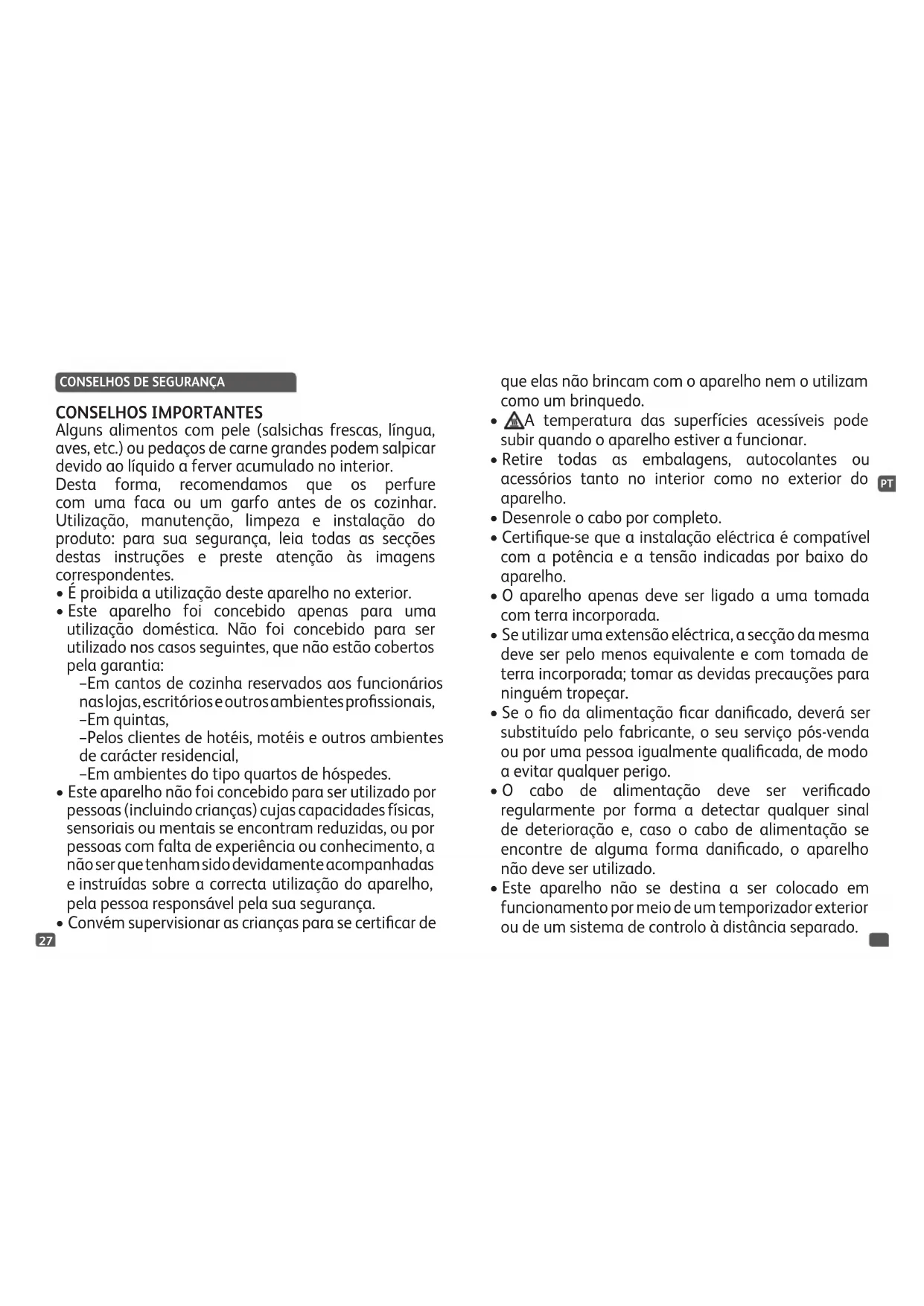 CONSELHOS IMPORTANTES Alguns alimentos com pele (salsichas frescas, língua, aves, etc.) ou pedaços de carne grandes podem salpicar devido ao líquido a ferver acumulado no interior. Desta forma, recomendamos que os perfure com uma faca ou um garfo antes de os cozinhar. Utilização, manutenção, limpeza e instalação do produto: para sua segurança, leia todas as secções destas instruções e preste atenção às imagens correspondentes.