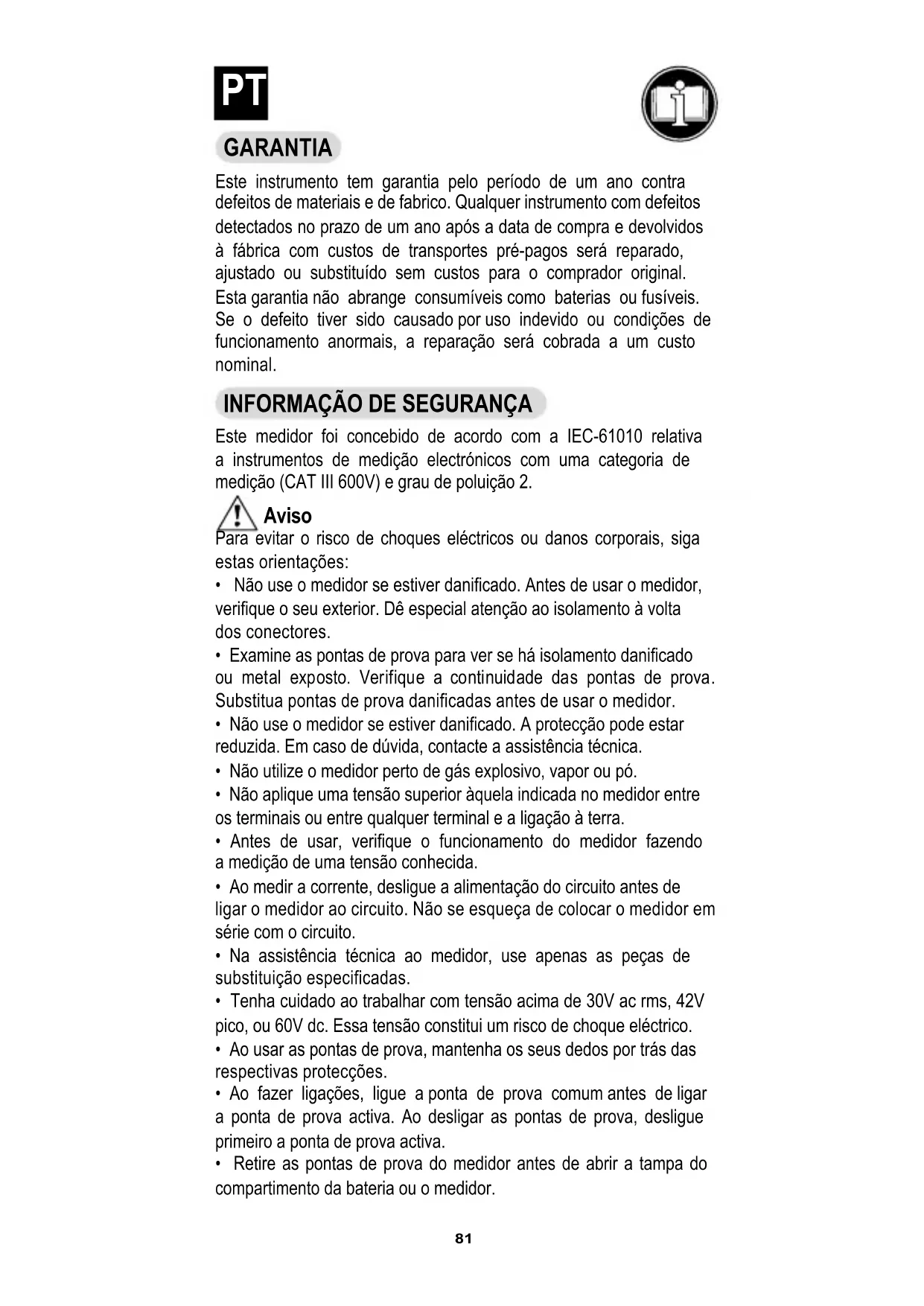 - Retire as pontas de prova do medidor antes de abrir a tampa do compartimento da bateria ou o medidor. PT82