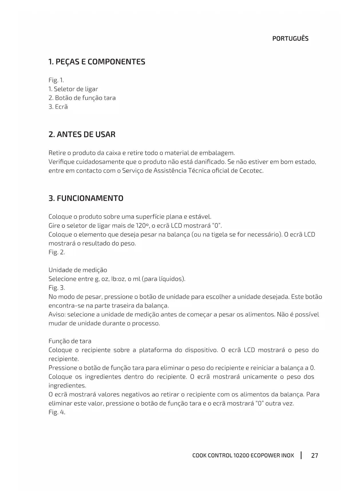 Coloque o produto sobre uma superfície plana e estável. Gire o seletor de ligar mais de 120º, o ecrã LCD mostrará “0”. Coloque o elemento que deseja pesar na balança (ou na tigela se for necessário). O ecrã LCD mostrará o resultado do peso. Fig. 2. Unidade de medição Selecione entre g, oz, Ib:oz, o ml (para líquidos). Fig. 3. No modo de pesar, pressione o botão de unidade para escolher a unidade desejada. Este botão encontra-se na parte traseira da balança. Aviso: selecione a unidade de medição antes de começar a pesar os alimentos. Não é possível mudar de unidade durante o processo. Função de tara Coloque o recipiente sobre a plataforma do dispositivo. O ecrã LCD mostrará o peso do recipiente. Pressione o botão de função tara para eliminar o peso do recipiente e reiniciar a balança a 0. Coloque os ingredientes dentro do recipiente. O ecrã mostrará unicamente o peso dos ingredientes. O ecrã mostrará valores negativos ao retirar o recipiente com os alimentos da balança. Para eliminar este valor, pressione o botão de função tara e o ecrã mostrará “0” outra vez. Fig. 4.28 PORTUGUÊS