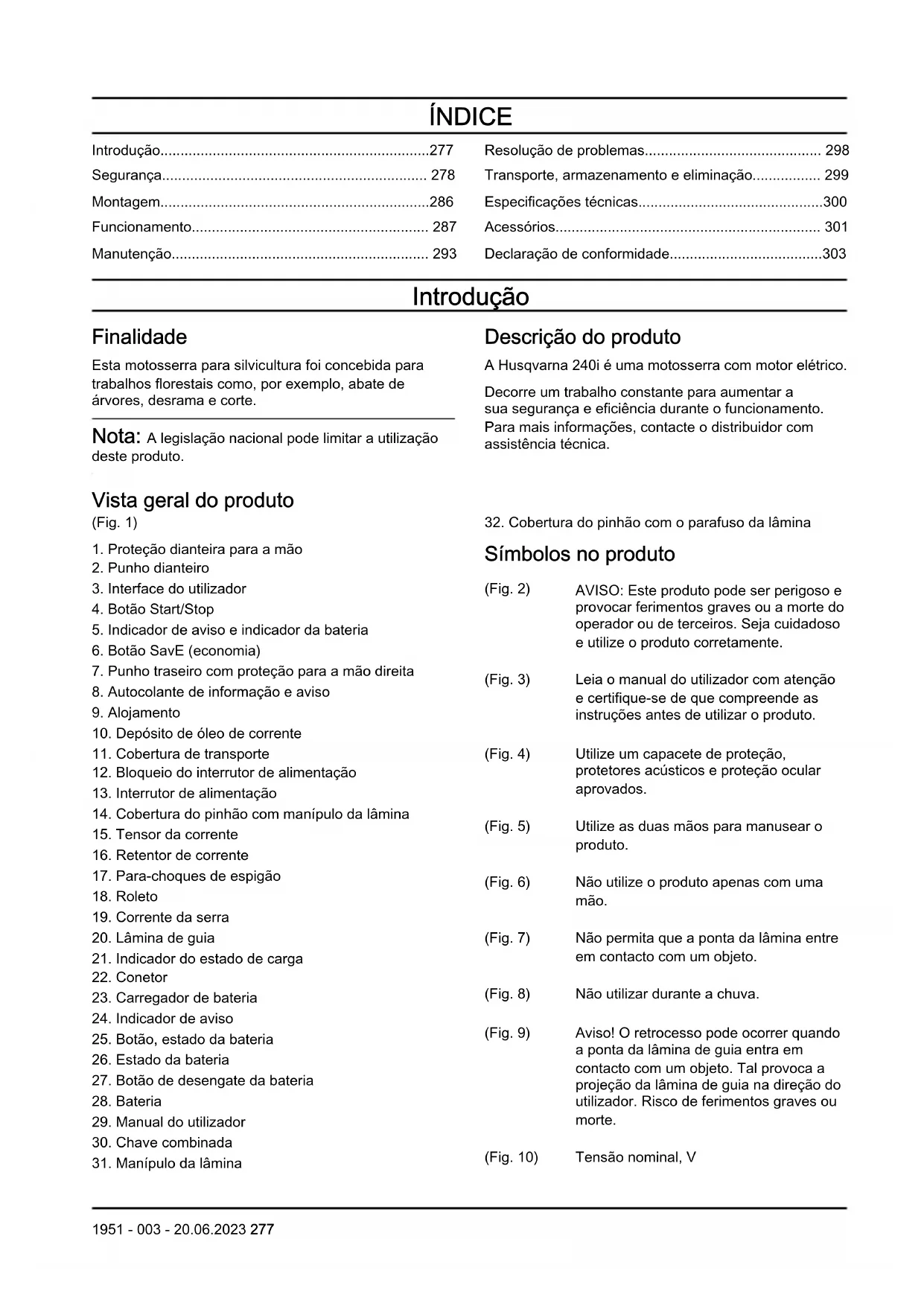 - Declaração de conformidade Introdução Finalidade Esta motosserra para silvicultura foi concebida para trabalhos florestais como, por exemplo, abate de árvores, desrama e corte. Nota: A legislação nacional pode limitar a utilização deste produto. Descrição do produto A Husqvarna 240i é uma motosserra com motor elétrico. Decorre um trabalho constante para aumentar a sua segurança e eficiência durante o funcionamento. Para mais informações, contacte o distribuidor com assistência técnica. Vista geral do produto (Fig. 1) p. 303