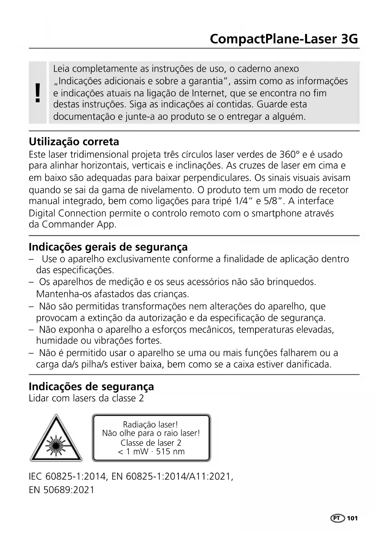 Indicações de segurança Lidar com radiação eletromagnética Indicações de segurança Lidar com radiação de radiofrequência RF – O aparelho cumpre os regulamentos e valores limite relativos à compatibilidade eletromagnética nos termos da diretiva CEM 2014/30/UE, que é abrangida pela diretiva RED 2014/53/UE. – Observar limitações operacionais locais, como p. ex. em hospitais, aviões, estações de serviço, ou perto de pessoas com pacemarkers. Existe a possibilidade de uma inuência ou perturbação perigosa de aparelhos eletrónicos e devido a aparelhos eletrónicos. – A utilização perto de tensões elevadas ou sob campos eletromagnéticos alterados elevados pode inuenciar a precisão de medição. – O aparelho de medição está equipado com uma interface via rádio. – O aparelho cumpre os regulamentos e valores limite relativos à compatibilidade eletromagnética e à radiação de radio-frequência nos termos da diretiva RED 2014/53/UE. – A Umarex GmbH & Co. KG declara que o modelo de equipamento de rádio CompactPlane-Laser 3G está em conformidade com os requisitos essenciais e demais disposições da diretiva europeia sobre Radio Equipment 2014/53/UE (RED). O texto integral da declaração de conformidade da UE está disponível no seguinte endereço de Internet: https://packd.li/ll/anb/in – Atenção: não olhar para o raio direto ou reetido. – Não orientar o aparelho para pessoas. – Se uma radiação de laser da classe 2 entrar nos olhos, feche conscientemente os olhos e afaste imediatamente a cabeça do raio. – Nunca olhe para o feixe de laser nem para os seus reexos com aparelhos ópticos (lupa, microscópio, telescópio, ...). – Não use o laser à altura dos olhos (1,40…1,90 m). – Superfícies bem reetoras, espelhadas ou brilhantes devem ser cobertas durante a operação com dispositivos a laser. – Em áreas de tráfego públicas, limitar ao máximo possível o feixe de laser, por intermédio de vedações e divisórias, e assinalar a zona do laser com placas de aviso. PTCompactPlane-Laser 3G