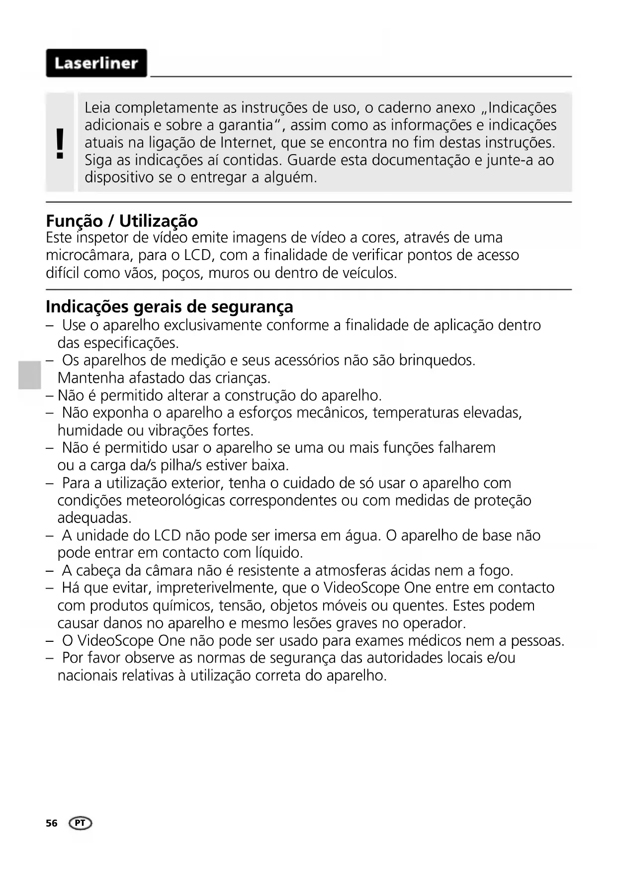 EY-määräykset ja hävittäminen Laite täyttää kaikki EY:n sisällä tapahtuvaa vapaata tavaravaihtoa koskevat standardit. Tämä tuote on sähkölaite. Se on kierrätettävä tai hävitettävä vanhoja sähkö- ja elektroniikkalaitteita koskevan EY-direktiivin mukaan. Lisätietoja, turvallisuus- yms. ohjeita: www.laserliner.com/info Tekniset tiedot Tekniset muutokset mahdollisia. 21W38 Kamerapään halkaisija ø 9 mm Näyttö 2,7" TFT-värinäyttö Näytön tarkkuus 320 x 240 pikseliä Suojausluokka kameran anturi IP 68 Kameran tarkkuus 320 x 240 pikseliä Yhteydet Videolähtö Cinch Näkökenttä (FOV) 53° Syväterävyys (DOF) 3 … 7 cm Anturin pituus 1,5 m Virtalähde 4 x 1,5V LR6 (AA) Paristojen käyttöikä n. 4 h Käyttöympäristö 0°C … 45°C, ilmankosteus maks. 20 … 85% rH, ei kondensoituva, asennuskorkeus maks. 4000 m merenpinnasta Varastointiolosuhteet -10°C … 60°C, ilmankosteus maks. 80% rH Mitat (L x K x S) 100 x 200 x 130 mm (ilman kaapelia) Paino 510 g (sis. paristot) FI56 Indicações gerais de segurança – Use o aparelho exclusivamente conforme a nalidade de aplicação dentro das especicações. – Os aparelhos de medição e seus acessórios não são brinquedos. Mantenha afastado das crianças. – Não é permitido alterar a construção do aparelho. – Não exponha o aparelho a esforços mecânicos, temperaturas elevadas, humidade ou vibrações fortes. – Não é permitido usar o aparelho se uma ou mais funções falharem ou a carga da/s pilha/s estiver baixa. – Para a utilização exterior, tenha o cuidado de só usar o aparelho com condições meteorológicas correspondentes ou com medidas de proteção adequadas. – A unidade do LCD não pode ser imersa em água. O aparelho de base não pode entrar em contacto com líquido. – A cabeça da câmara não é resistente a atmosferas ácidas nem a fogo. – Há que evitar, impreterivelmente, que o VideoScope One entre em contacto com produtos químicos, tensão, objetos móveis ou quentes. Estes podem causar danos no aparelho e mesmo lesões graves no operador. – O VideoScope One não pode ser usado para exames médicos nem a pessoas. – Por favor observe as normas de segurança das autoridades locais e/ou nacionais relativas à utilização correta do aparelho. Função / Utilização Este inspetor de vídeo emite imagens de vídeo a cores, através de uma microcâmara, para o LCD, com a nalidade de vericar pontos de acesso difícil como vãos, poços, muros ou dentro de veículos. Leia completamente as instruções de uso, o caderno anexo „Indicações adicionais e sobre a garantia“, assim como as informações e indicações atuais na ligação de Internet, que se encontra no fim destas instruções. Siga as indicações aí contidas. Guarde esta documentação e junte-a ao dispositivo se o entregar a alguém.