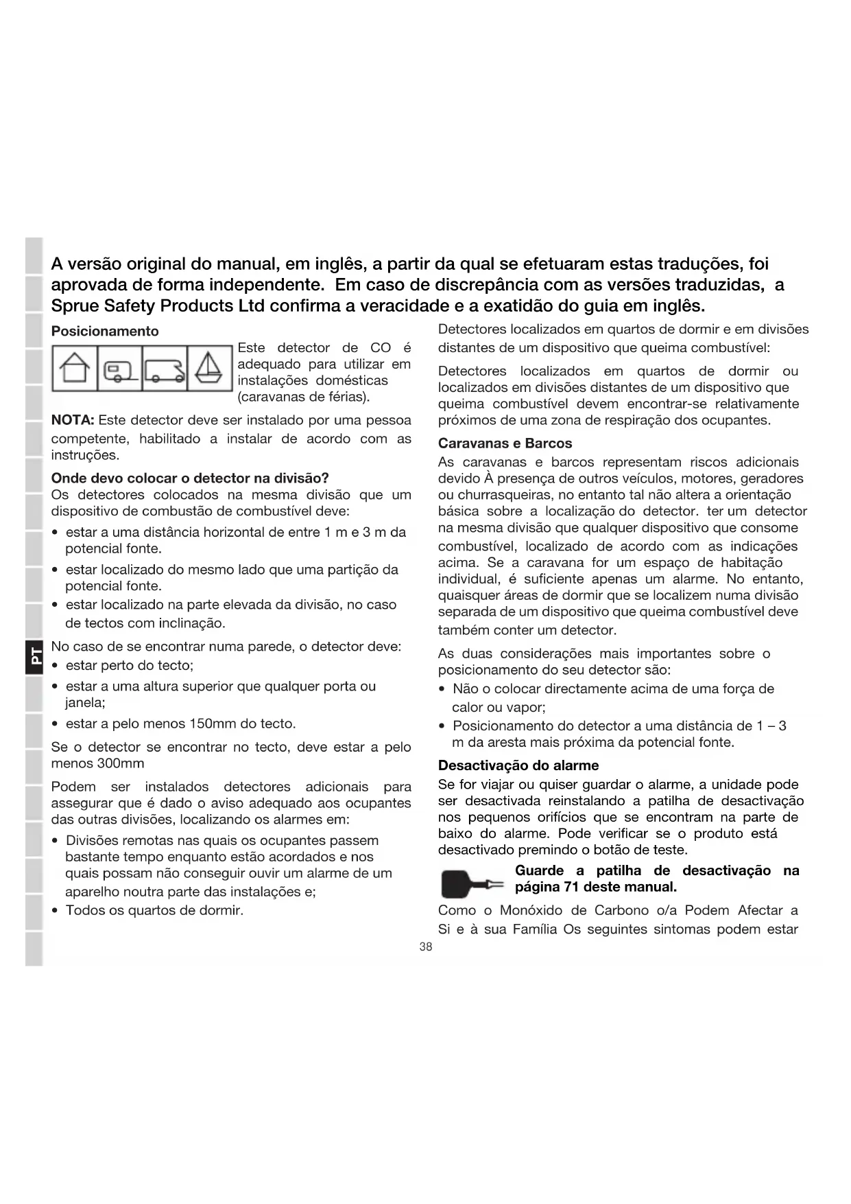 - Posicionamento do detector a uma distância de 1 – 3 m da aresta mais próxima da potencial fonte. Desactivação do alarme Se for viajar ou quiser guardar o alarme, a unidade pode ser desactivada reinstalando a patilha de desactivação nos pequenos orifícios que se encontram na parte de baixo do alarme. Pode vericar se o produto está desactivado premindo o botão de teste. Guarde a patilha de desactivação na página 71 deste manual. Como o Monóxido de Carbono o/a Podem Afectar a Si e à sua Família Os seguintes sintomas podem estar A versão original do manual, em inglês, a partir da qual se efetuaram estas traduções, foi aprovada de forma independente. Em caso de discrepância com as versões traduzidas, a Sprue Safety Products Ltd conrma a veracidade e a exatidão do guia em inglês.39