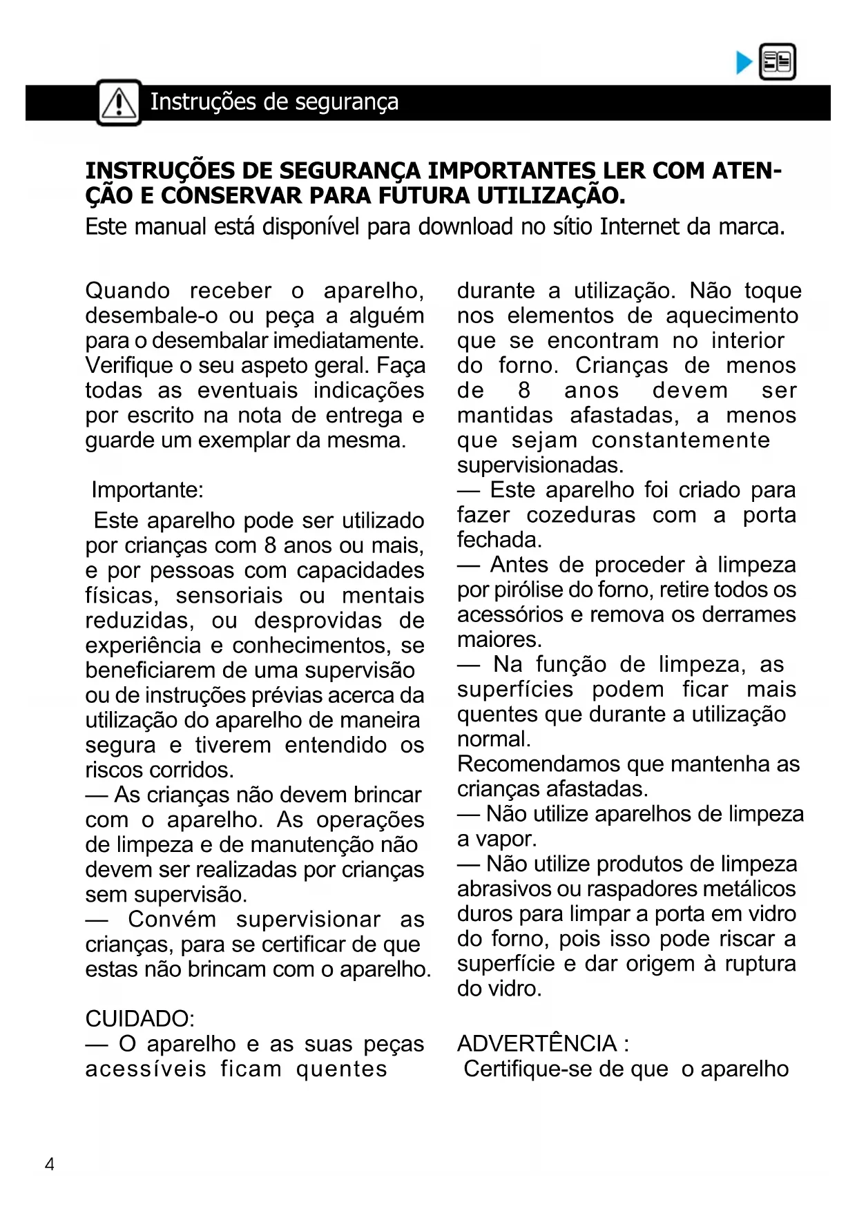 SVÍndice https://brandt.com/ BVCert.6011825 Importante: Antes de ligar o seu aparelho, leia com atenção este guia de instalação e utilização, para se familiarizar mais rapidamente com o seu funcionamento. O rótulo "Origine France Garantie" fornece aos consumidores a rastrea- bilidade de um produto, dando uma indicação clara e objetiva da ori- gem. A marca BRANDT tem o orgulho de axar este rótulo em produtos de nossas fábricas francesas sediadas em Orléans e Vendôme. Caro(a) cliente, Acaba de adquirir um produto BRANDT e agradecemos a conança que depositou em nós. Desenhámos e fabricámos este produto pensando em si, no seu modo de vida e nas suas necessidades, para poder responder da melhor forma possível às suas expectativas. Usámos o nosso conhecimento especializado, o nosso espírito inovador e toda a paixão que nos motiva desde há mais de 60 anos. Com a preocupação constante de melhor satisfazer as suas exigências, o nosso serviço ao consumidor está à sua disposição para responder a todas as suas dúvidas ou sugestões. Visite também o nosso site www.brandt.com onde encontrará as mais recentes inovações, bem como informação útil e complementar. A BRANDT tem o prazer de acompanhá-lo(a) na sua vida quotidiana e espera que desfrute da sua compra da melhor forma possível.3 Índice Instruções de segurança ............................................................... 4