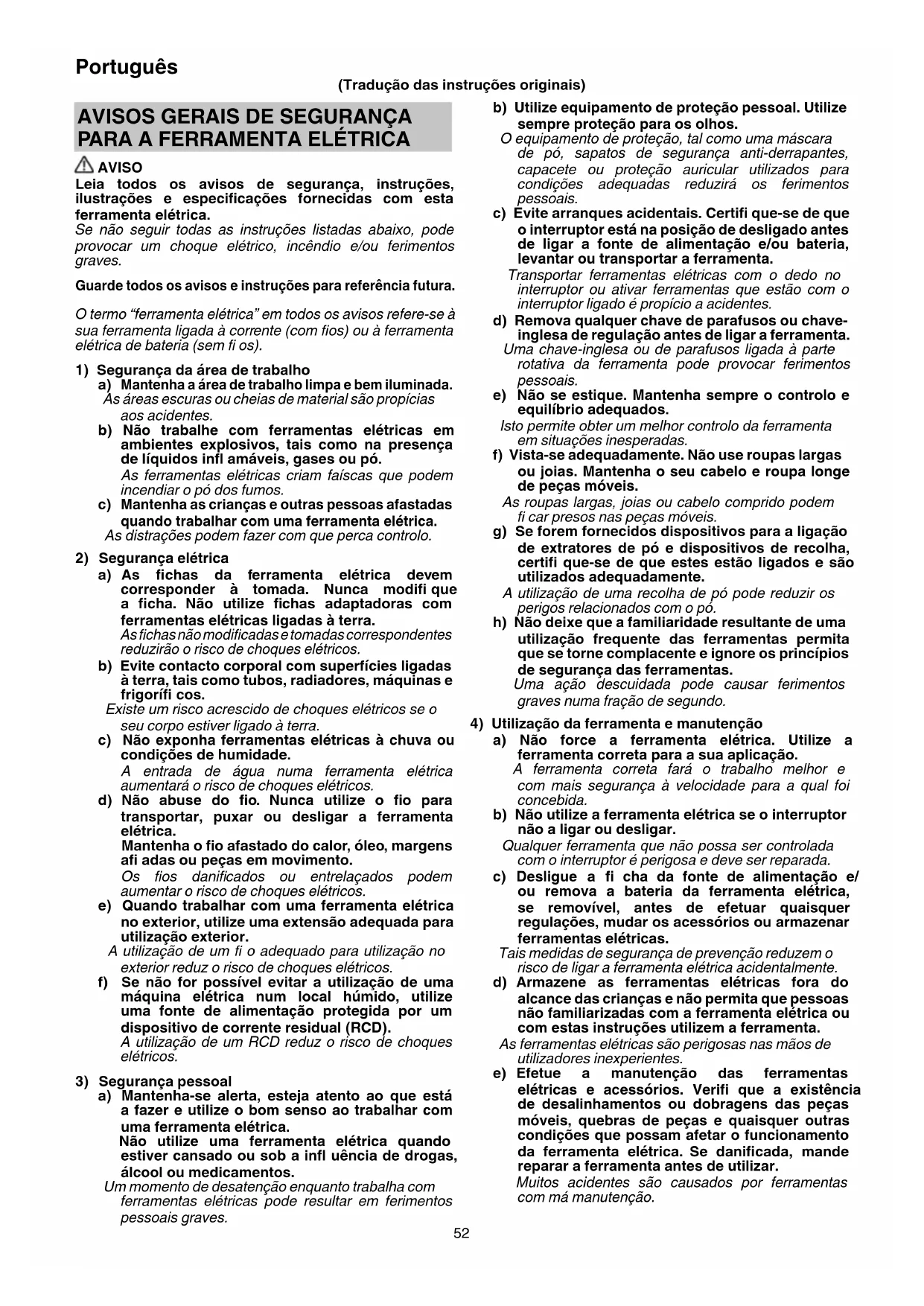 a) Mantenha-se alerta, esteja atento ao que está a fazer e utilize o bom senso ao trabalhar com uma ferramenta elétrica. Não utilize uma ferramenta elétrica quando estiver cansado ou sob a infl uência de drogas, álcool ou medicamentos. Um momento de desatenção enquanto trabalha com ferramentas elétricas pode resultar em ferimentos pessoais graves. (Tradução das instruções originais) 0000BookWH18DD.indb520000BookWH18DD.indb52 2022/04/2511:15:092022/04/2511:15:0953 Português f) Mantenha as ferramentas de corte afi adas e limpas. As ferramentas de corte com uma manutenção adequada e extremidades afi adas são menos propensas a dobrar e mais fáceis de controlar.