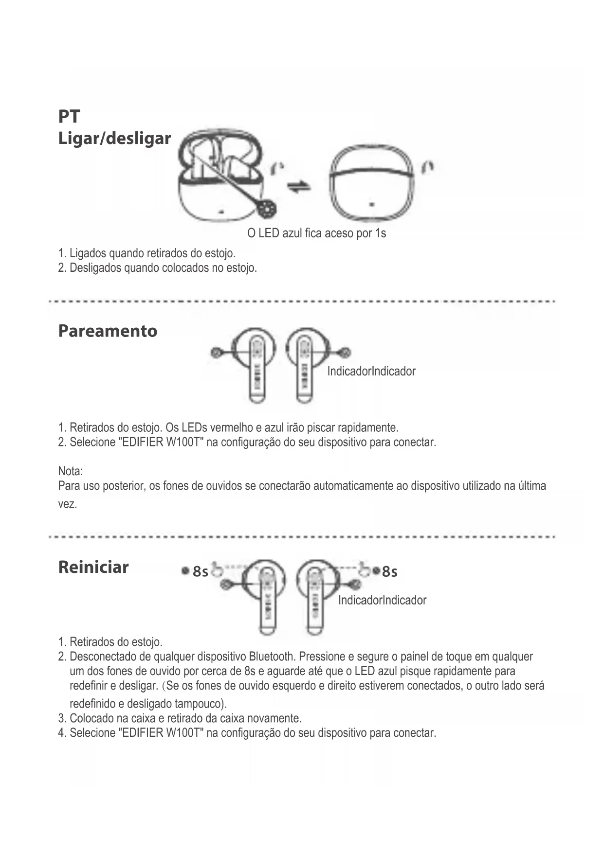 Reiniciar 1. Retirados do estojo.2. Desconectado de qualquer dispositivo Bluetooth. Pressione e segure o painel de toque em qualquer um dos fones de ouvido por cerca de 8s e aguarde até que o LED azul pisque rapidamente para redefinir e desligar. (Se os fones de ouvido esquerdo e direito estiverem conectados, o outro lado será redefinido e desligado tampouco).3. Colocado na caixa e retirado da caixa novamente.4. Selecione "EDIFIER W100T" na configuração do seu dispositivo para conectar. O LED azul fica aceso por 1s