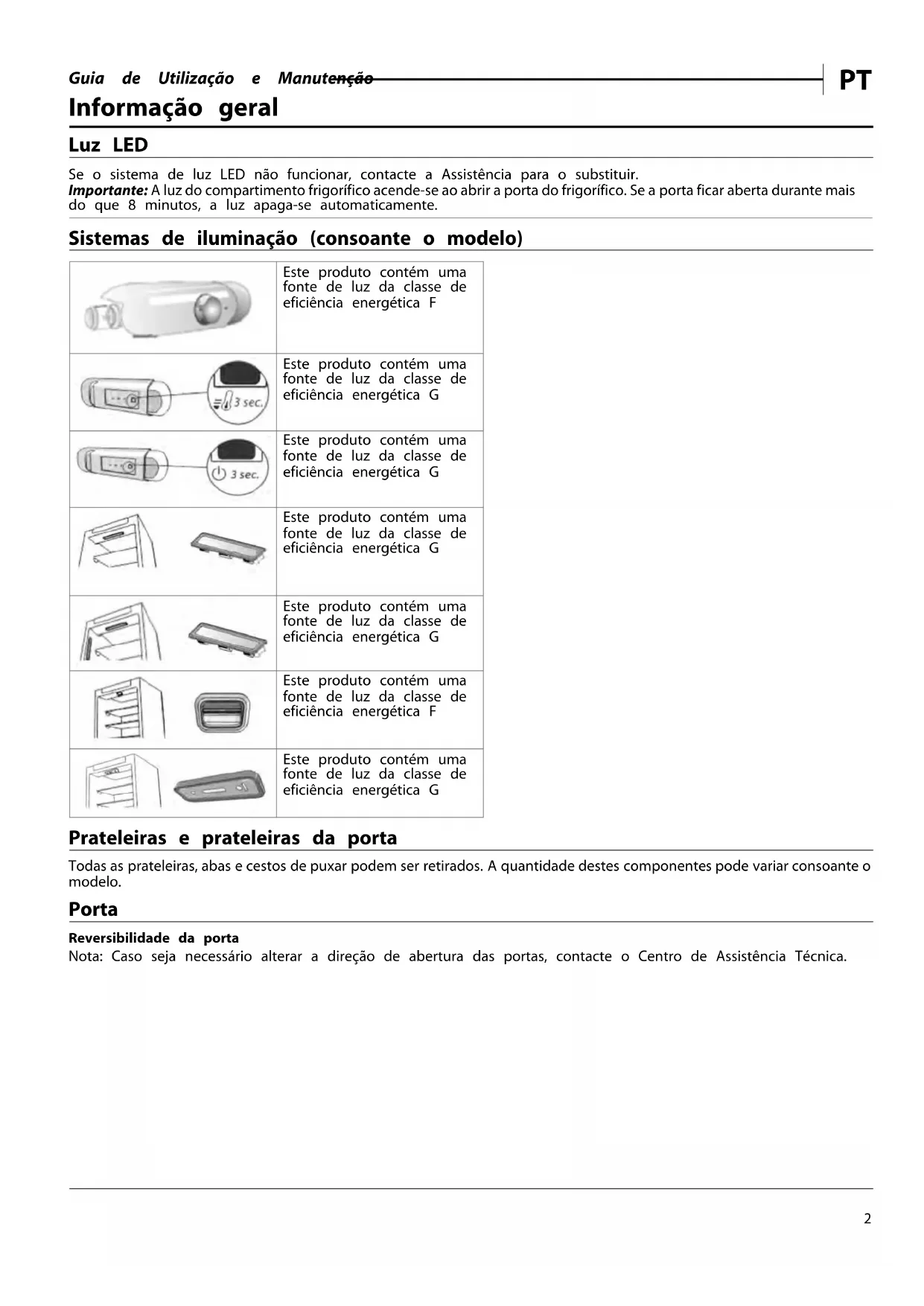 Informação geral Luz LED Se o sistema de luz LED não funcionar, contacte a Assistência para o substituir. Importante: A luz do compartimento frigorífico acende-se ao abrir a porta do frigorífico. Se a porta ficar aberta durante mais do que 8 minutos, a luz apaga-se automaticamente. Sistemas de iluminação (consoante o modelo) Este produto contém uma fonte de luz da classe de eficiência energética F Este produto contém uma fonte de luz da classe de eficiência energética G Este produto contém uma fonte de luz da classe de eficiência energética G Este produto contém uma fonte de luz da classe de eficiência energética G Este produto contém uma fonte de luz da classe de eficiência energética G Este produto contém uma fonte de luz da classe de eficiência energética F Este produto contém uma fonte de luz da classe de eficiência energética G Prateleiras e prateleiras da porta Todas as prateleiras, abas e cestos de puxar podem ser retirados. A quantidade destes componentes pode variar consoante o modelo. Porta Reversibilidade da porta Nota: Caso seja necessário alterar a direção de abertura das portas, contacte o Centro de Assistência Técnica.Guia de Utilização e Manutenção