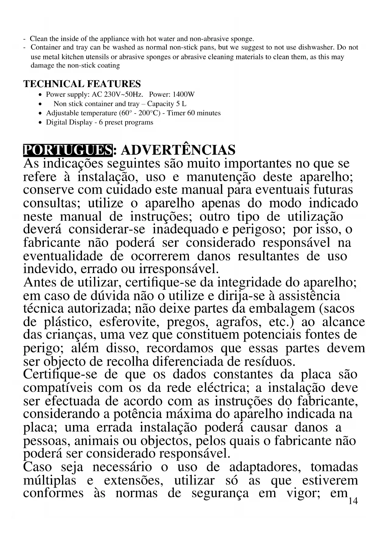 As indicações seguintes são muito importantes no que se refere à instalação, uso e manutenção deste aparelho; conserve com cuidado este manual para eventuais futuras consultas; utilize o aparelho apenas do modo indicado neste manual de instruções; outro tipo de utilização deverá considerar-se inadequado e perigoso; por isso, o fabricante não poderá ser considerado responsável na eventualidade de ocorrerem danos resultantes de uso indevido, errado ou irresponsável. Antes de utilizar, certifique-se da integridade do aparelho; em caso de dúvida não o utilize e dirija-se à assistência técnica autorizada; não deixe partes da embalagem (sacos de plástico, esferovite, pregos, agrafos, etc.) ao alcance das crianças, uma vez que constituem potenciais fontes de perigo; além disso, recordamos que essas partes devem ser objecto de recolha diferenciada de resíduos. Certifique-se de que os dados constantes da placa são compatíveis com os da rede eléctrica; a instalação deve ser efectuada de acordo com as instruções do fabricante, considerando a potência máxima do aparelho indicada na placa; uma errada instalação poderá causar danos a pessoas, animais ou objectos, pelos quais o fabricante não poderá ser considerado responsável. Caso seja necessário o uso de adaptadores, tomadas múltiplas e extensões, utilizar só as que estiverem conformes às normas de segurança em vigor; em15 qualquer caso, nunca ultrapassar os limites de absorção indicados no adaptador e/ou nas extensões, nem os de máxima potência indicados nos adaptadores múltiplos. Não deixar o aparelho inutilmente ligado à corrente; é preferível retirar a ficha da tomada eléctrica quando o aparelho não estiver a ser utilizado. Sempre desconecte o aparelho da fonte de alimentação se for deixado sem supervisão. Operações de limpeza devem ser efectuadas depois de se ter desligado a ficha da tomada eléctrica. Sempre que o aparelho estiver fora de uso e seja decidido não o reparar, recomenda-se a sua inutilização, cortando- lhe o cabo de alimentação; - Não aproximar o cabo de alimentação de objectos cortantes ou de superfícies quentes, e não o puxar para arrancar a ficha da tomada eléctrica. Não deixe que ele fique pendurado na bancada onde a criança pode segurá- lo. Não utilizar o aparelho no caso de o cabo de alimentação ou a ficha se encontrarem danificados, ou em caso de curto-circuitos; Nessa eventualidade, leve o aparelho a um centro de assistência autorizado. - Não expor o aparelho a condições atmosféricas adversas, como chuva, humidade, gelo. Conserve em lugar seco. - Não manusear ou tocar o aparelho com as mãos molhadas ou os pés descalços. - Este aparelho pode ser utilizado por crianças com mais de 8 anos e por pessoas com reduzida capacidade física, sensorial ou mental, ou ainda com falta de experiência na sua utilização, desde que lhes seja assegurada uma adequada supervisão ou se tiverem sido instruídas no uso do aparelho em segurança; as operações de limpeza e de manutenção não devem ser efectuadas por crianças, a menos que tenham mais de 8 anos e sejam supervisionadas. - Mantenha o aparelho e o cabo de alimentação fora do alcance de crianças com menos de 8 anos de idade.16 - As crianças não devem brincar com o aparelho. Se o cabo de alimentação estiver danificado, ou em caso de falha e / ou avaria, não mexa no aparelho. Qualquer reparação deve ser realizada pelo fabricante ou pelo seu serviço de assistência técnica ou, em qualquer caso, por uma pessoa com qualificação semelhante, a fim de evitar qualquer risco. O não cumprimento dos itens acima pode comprometer a segurança e invalidar a garantia. ATENÇÃO: este aparelho inclui uma função de aquecimento. Algumas superfícies, mesmo que não a placa propriamente dita, poderão atingir temperaturas elevadas. Uma vez que a sensibilidade à temperatura difere de pessoa para pessoa, este aparelho deverá ser usado com CUIDADO. Coloque o aparelho exclusivamente sobre superfícies com aderência e preparadas para o efeito, - Antes de cada utilização, soltar o cabo de alimentação. - Este aparelho foi concebido para uso doméstico ou equivalente, em situações como as de refeitórios em pequenas empresas ou outros ambientes de natureza laboral; por clientes de hotéis, motéis ou acomodação turística, como turismo rural ou residencial. - Este aparelho não foi concebido para ser utilizado por intermédio de um temporizador externo ou de um sistema de comando à distância autónomo. - Utilizar somente acessórios e componentes originais. - Manter o aparelho afastado de materiais inflamáveis, fontes de calor, zonas frias e vapor. Não sujeite produto a impactos, pois isso pode danificá-lo