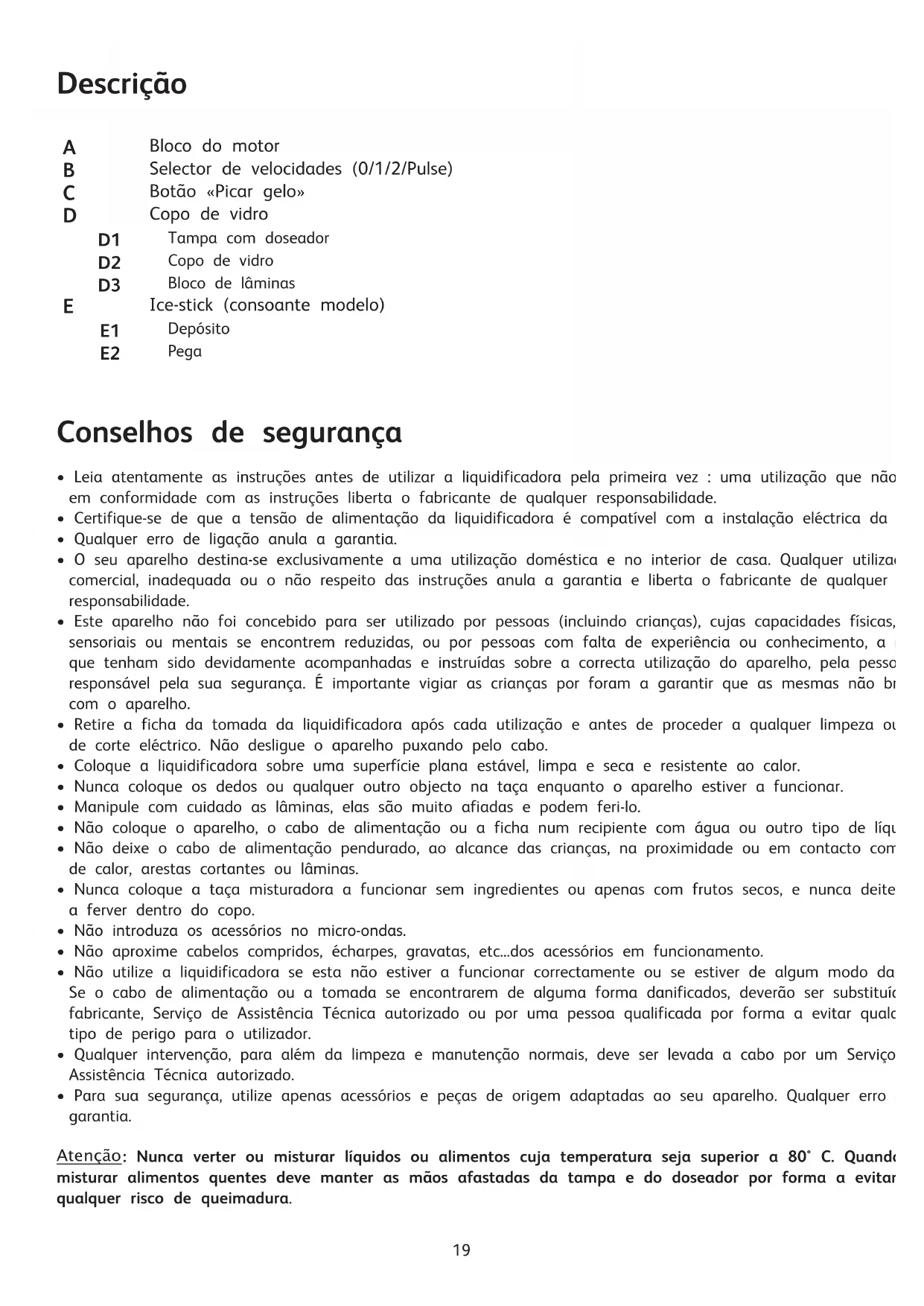 - Para sua segurança, utilize apenas acessórios e peças de origem adaptadas ao seu aparelho. Qualquer erro anula a garantia. Atenção : Nunca verter ou misturar líquidos ou alimentos cuja temperatura seja superior a 80° C. Quando misturar alimentos quentes deve manter as mãos afastadas da tampa e do doseador por forma a evitar qualquer risco de queimadura.20 Primeira utilização