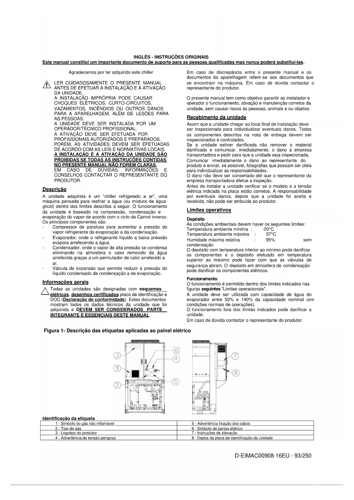 PRODUTOR. Descrição A unidade adquirida é um “chiller refrigerado a ar”, uma máquina pensada para resfriar a água (ou mistura de água- glicol) dentro dos limites descritos a seguir. O funcionamento da unidade é baseado na compressão, condensação e evaporação do vapor de acordo com o ciclo de Carnot inverso. Os principais componentes são: - Compressor de parafuso para aumentar a pressão do vapor refrigerante da evaporação a da condensação. - Evaporador, onde o refrigerante líquido a baixa pressão evapora arrefecendo a água. - Condensador, onde o vapor de alta pressão se condensa eliminando na atmosfera o calor removido da água arrefecida graças a um permutador de calor arrefecido a ar. - Válvula de expansão que permite reduzir a pressão do líquido condensado de condensação a de evaporação. Informações gerais Todas as unidades são designadas com esquemas elétricos, desenhos certificados placa de identificação e DOC (Declaração de conformidade). Estes documentos mostram todos os dados técnicos da unidade que foi adquirida e DEVEM SER CONSIDERADOS PARTE INTEGRANTE E ESSENCIAIS DESTE MANUAL. Em caso de discrepância entre o presente manual e os documentos da aparelhagem referir-se aos documentos que se encontram na máquina. Em caso de dúvida contactar o representante do produtor. O presente manual tem como objetivo garantir ao instalador e operador o funcionamento, ativação e manutenção corretos da unidade, sem causar riscos às pessoas, animais e ou objetos. Recebimento da unidade Assim que a unidade chegar ao local final de instalação deve ser inspecionada para individualizar eventuais danos. Todos os componentes descritos na nota de entrega devem ser inspecionados e controlados. Se a unidade estiver danificada não remover o material danificado e comunicar, imediatamente, o dano à empresa transportadora e pedir para que a unidade seja inspecionada. Comunicar imediatamente o dano ao representante do produto e enviar, se possível, fotografias que possam ser úteis para individualizar as responsabilidades. O dano não deve ser consertado até que o representante da empresa transportadora efetue a inspeção. Antes de instalar a unidade verificar se o modelo e a tensão elétrica indicada na placa estão corretos. A responsabilidade por eventuais danos, depois que a unidade foi aceita e recebida, não pode ser atribuída ao produtor. Limites operativos Depósito As condições ambientais devem haver os seguintes limites: Temperatura ambiente mínima : -20°C Temperatura ambiente máxima : 57°C Humidade máxima relativa : 95% sem condensação O depósito com temperatura inferior ao mínimo pode danificar os componentes e o depósito efetuado em temperatura superior ao máximo pode fazer com que as válvulas de segurança abram. O depósito em atmosfera de condensação pode danificar os componentes elétricos. Funcionamento O funcionamento é permitido dentro dos limites indicados nas figuras seguintes "Limites operacionais". A unidade deve ser utilizada com capacidade de água do evaporador entre 50% e 140% da capacidade nominal (em condições normais de operações). O funcionamento fora dos limites indicados pode danificar a unidade. Em caso de dúvida contactar o representante do produtor. Figura 1- Descrição das etiquetas aplicadas ao painel elétrico