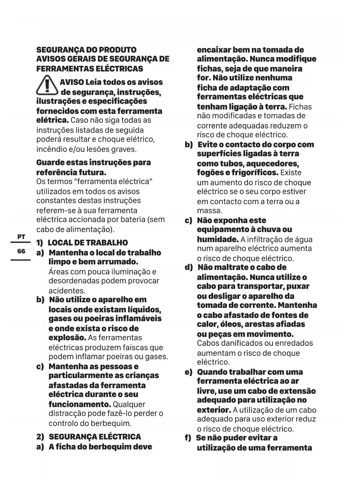 a) A ficha do berbequim deve encaixar bem na tomada de alimentação. Nunca modifique fichas, seja de que maneira for. Não utilize nenhuma ficha de adaptação com ferramentas eléctricas que tenham ligação à terra. Fichas não modificadas e tomadas de corrente adequadas reduzem o risco de choque eléctrico. b) Evite o contacto do corpo com superfícies ligadas à terra como tubos, aquecedores, fogões e frigoríficos. Existe um aumento do risco de choque eléctrico se o seu corpo estiver em contacto com a terra ou a massa. c) Não exponha este equipamento à chuva ou humidade. A infiltração de água num aparelho eléctrico aumenta o risco de choque eléctrico. d) Não maltrate o cabo de alimentação. Nunca utilize o cabo para transportar, puxar ou desligar o aparelho da tomada de corrente. Mantenha o cabo afastado de fontes de calor, óleos, arestas afiadas ou peças em movimento. Cabos danificados ou enredados aumentam o risco de choque eléctrico. e) Quando trabalhar com uma ferramenta eléctrica ao ar livre, use um cabo de extensão adequado para utilização no exterior. A utilização de um cabo adequado para uso exterior reduz o risco de choque eléctrico. f) Se não puder evitar a utilização de uma ferramenta67
