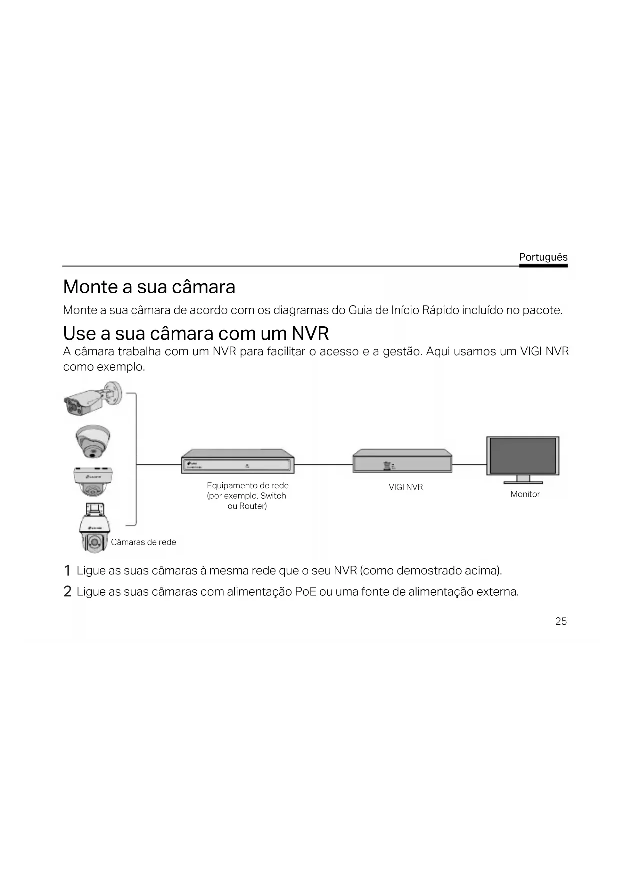 Le telecamere presenti nella stessa rete del vostro computer possono essere rilevate automaticamente. Andate in Impostazioni > Dispositivi Rilevati, fate clic su + Aggiungi per attivare le vostre telecamere trovate impostando le password, e seguite le istruzioni per aggiungere le vostre telecamere. Per le domande frequenti (FAQ), consultate https://www.tp-link.com/support/faq/2850/25 Português Monte a sua câmara Monte a sua câmara de acordo com os diagramas do Guia de Início Rápido incluído no pacote. Use a sua câmara com um NVR A câmara trabalha com um NVR para facilitar o acesso e a gestão. Aqui usamos um VIGI NVR como exemplo. Equipamento de rede (por exemplo, Switch ou Router) VIGI NVR Monitor Câmaras de rede