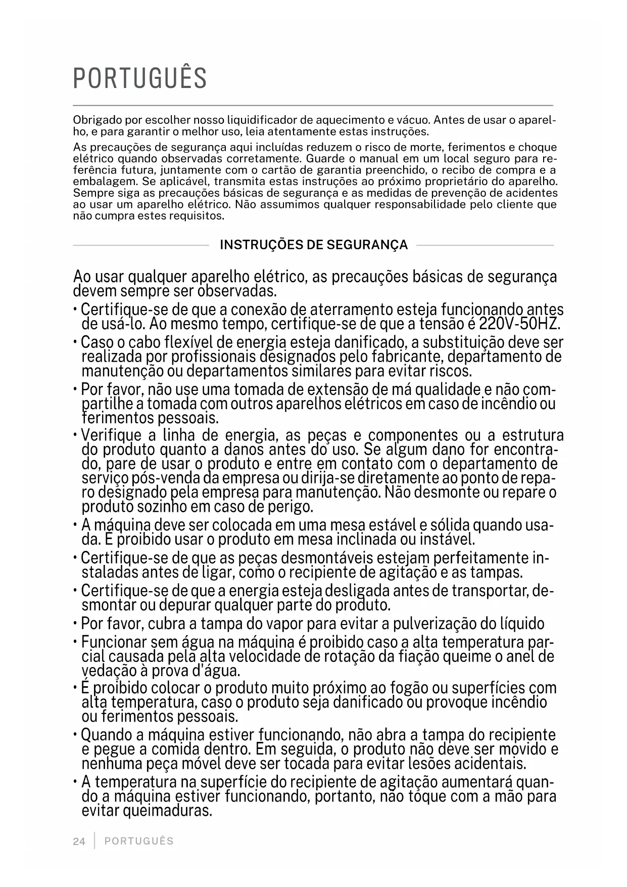 de agitação É usado para armazenar e processar alimentos com faca de mexer e placa de aquecimento no interior. Pode ser usado para fazer leite de soja, suco de frutas, sopa, pasta de arroz etc.27 PORTUGUÊS DESCRIÇÃO DA FUNÇÃO DO PAINEL DE OPERAÇÃO Botão Função Botão Iniciar/Parar: No estado de espera, escolha a função do menu an- tes de pressionar Iniciar/Parar e a máquina começa a funcionar. Quando a função do menu não é escolhida, pressionar o botão Start/Stop é inválido. No estado de espera, qualquer botão, exceto Iniciar/Parar, é inválido. De- pois de pressionar Iniciar/Parar, a máquina parará de funcionar e retor- nará ao modo pronto. Depois que o programa for executado por 1 minuto, continue pressionando por 3 segundos para cancelar o programa. Botão Reaquecer: No estado de espera, pressione este botão, a campain- ha soará, o indicador de reaquecimento permanecerá ligado, o tubo digi- tal exibirá o valor de temperatura denido correspondente e o botão pode ser girado ciclicamente (40° C - 100° C) Botão Misturar/Limpar: Para o modo de limpeza automática, pressione o botão Blend/Clean no estado de espera e pressione o botão Start/Stop para iniciar. No estado de espera, gire o botão, selecione o menu de função desejado e pressione Iniciar/Parar para iniciar. O programa é executado automatica- mente e, após o término, a campainha para após seis bipes. Botão de suco de frutas e vegetais: Coloque as frutas picadas no reci- piente de mistura, adicione a quantidade adequada de água (não pode exceder a escala máxima de 1750 ml), tampe bem a tampa do recipiente e gire o botão para a função suco. Neste momento, o botão acende, pres- sione Iniciar, o programa de suco é executado automaticamente. Primeiro aspire por 20 segundos, depois mexa e, nalmente, aspire por mais 40 segundos. Faça isso por cerca de 3 minutos e você desfrutará de um de- licioso suco. Botão de batido e smoothie: Despeje 500 ml de leite e 20 ml de mel. Adi- cione cerca de 250 g de fruta congelada (corte primeiro em pedaços de 20 mm) e selecione a função Milkshake. O botão acende. Pressione Iniciar, o programa é executado automaticamente. Primeiro, bombeie o vácuo por 20 segundos, mexa e, nalmente, aspire por mais 40 segundos. Após cer- ca de 3 minutos, o milk-shake está pronto. Botão de lama: Coloque uma quantidade adequada de cubos de gelo (cer- ca de 250 g) na bandeja de gelo da geladeira, coloque-a no recipiente de mistura, cubra o recipiente com a tampa e aperte-a e selecione a função slush. O botão acende, pressione Iniciar e o programa slush é executado automaticamente. 1 minuto e 20 segundos ou mais depois, sua lama está pronta. Botão de purê de batatas: Coloque as batatas cozidas e descascadas (não mais de 400 gramas) no recipiente de mistura, adicione cerca de 250 ml de água ou leite e 50 g de manteiga ou 50 ml de óleo. Cubra bem a tam- pa do recipiente e selecione a função purê de batatas. Neste momento, o botão acende. Pressione Iniciar, o programa é executado automatica- mente e cerca de 1 minuto depois, o delicioso purê de batatas está pronto. Você pode adicionar sal e especiarias ao seu gosto. Função do leite de soja: Coloque uma pequena quantidade de grãos de soja limpos (cerca de 100 gramas) no recipiente de mistura, adicione cer- ca de 1000 ml de água, tampe o recipiente e aperte-o. Selecione a função de leite de soja. Neste momento, o botão de leite de soja acende. Pres- sione Iniciar, o programa de leite de soja é executado automaticamente e cerca de 36 minutos depois, um delicioso leite de soja está pronto. Touche Lait d'amande : Mettre une petite quantité d'amandes (100 g) préalablement lavées et trempées environ 12 heures dans le récipient de mixage, ajouter environ 500 ml d'eau, couvrir le récipient et le serrer. Sélectionnez la fonction, puis la touche s'allume. Appuyez sur Start, le programme se lance automatiquement et environ 5 minutes plus tard, un délicieux lait d'amande est terminé.28 PORTUGUÊS