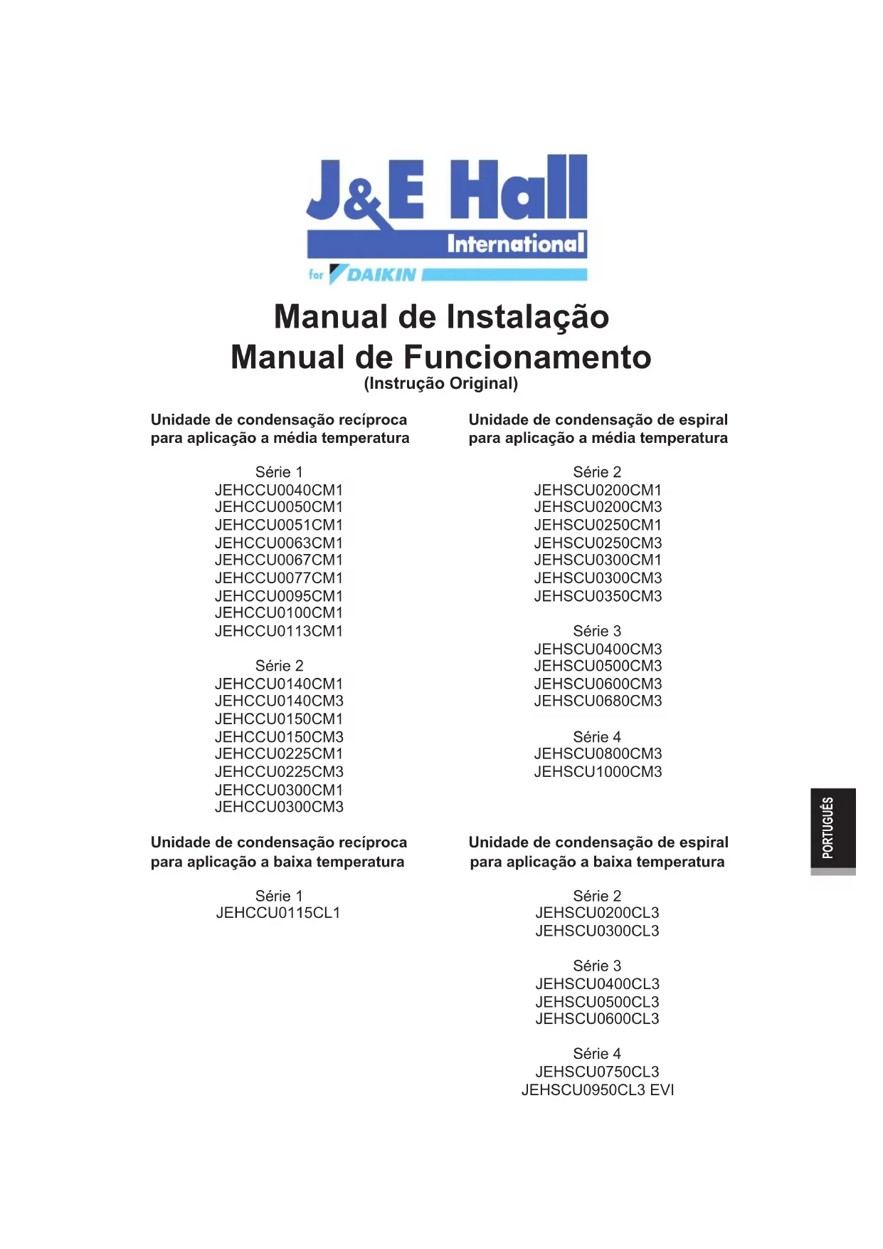 LISTA DI CONTROLLO PRIMA DELLA MESSA IN OPERA ITALIANOUnidade de condensação de espiral para aplicação a média temperatura Unidade de condensação recíproca para aplicação a média temperatura Série 1 JEHCCU0040CM1 JEHCCU0050CM1 JEHCCU0051CM1 JEHCCU0063CM1 JEHCCU0067CM1 JEHCCU0077CM1 JEHCCU0095CM1 JEHCCU0100CM1 JEHCCU0113CM1 Série 2 JEHCCU0140CM1 JEHCCU0140CM3 JEHCCU0150CM1 JEHCCU0150CM3 JEHCCU0225CM1 JEHCCU0225CM3 JEHCCU0300CM1 JEHCCU0300CM3 Unidade de condensação recíproca para aplicação a baixa temperatura Série 1 JEHCCU0115CL1 Série 2 JEHSCU0200CM1 JEHSCU0200CM3 JEHSCU0250CM1 JEHSCU0250CM3 JEHSCU0300CM1 JEHSCU0300CM3 JEHSCU0350CM3 Série 3 JEHSCU0400CM3 JEHSCU0500CM3 JEHSCU0600CM3 JEHSCU0680CM3 Série 4 JEHSCU0800CM3 JEHSCU1000CM3 Unidade de condensação de espiral para aplicação a baixa temperatura Série 2 JEHSCU0200CL3 JEHSCU0300CL3 Série 3 JEHSCU0400C
