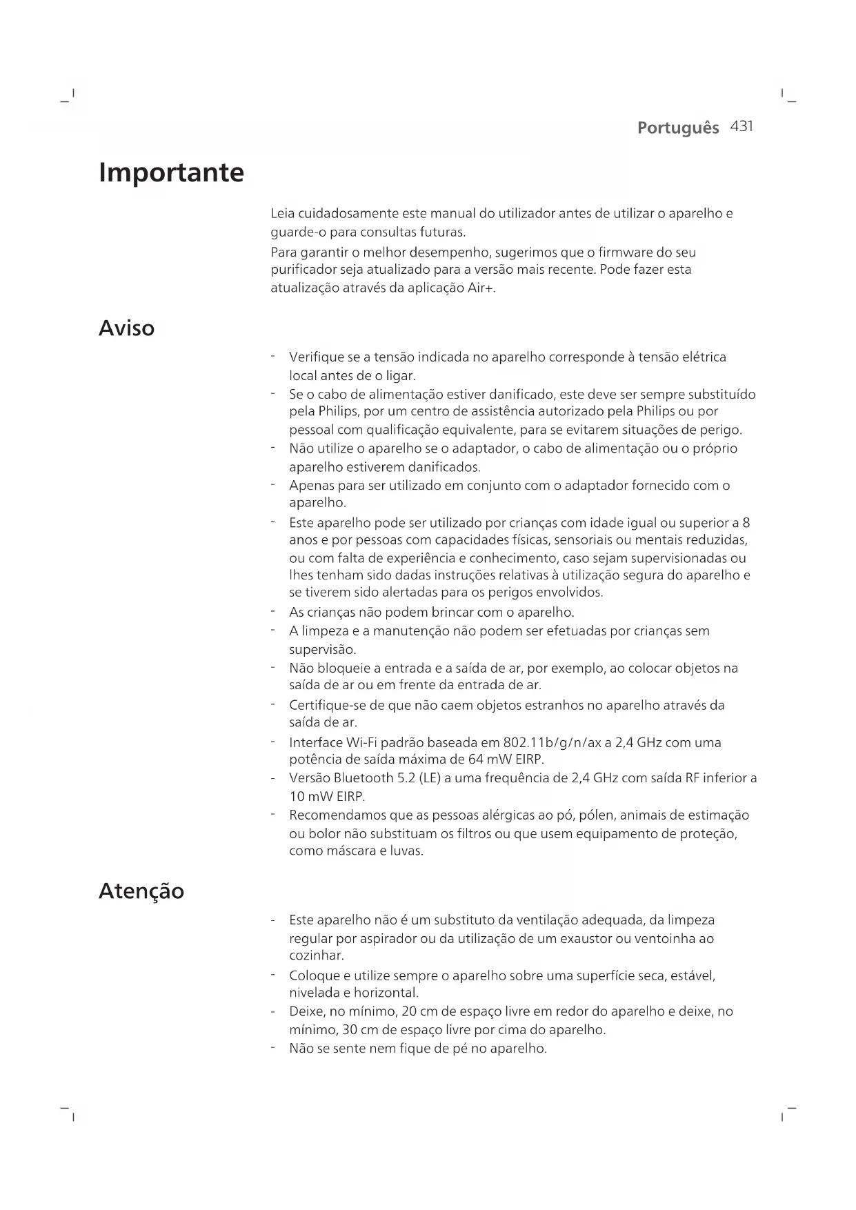 Português Importante Leia cuidadosamente este manual do utilizador antes de utilizar o aparelho e guarde-o para consultas futuras. Para garantir o melhor desempenho, sugerimos que o firmware do seu purificador seja atualizado para a versão mais recente. Pode fazer esta atualização através da aplicação Air+. Aviso