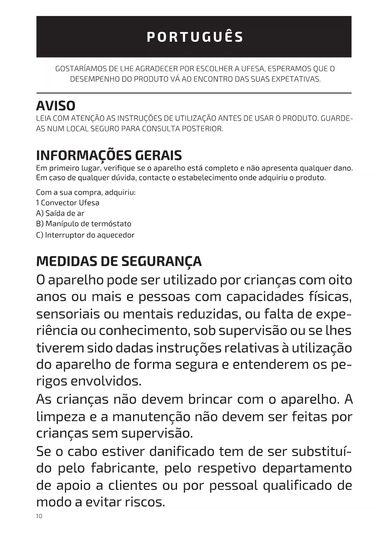 Em primeiro lugar, verifique se o aparelho está completo e não apresenta qualquer dano. Em caso de qualquer dúvida, contacte o estabelecimento onde adquiriu o produto. Com a sua compra, adquiriu: 1 Convector Ufesa A) Saída de ar B) Manípulo de termóstato C) Interruptor do aquecedor