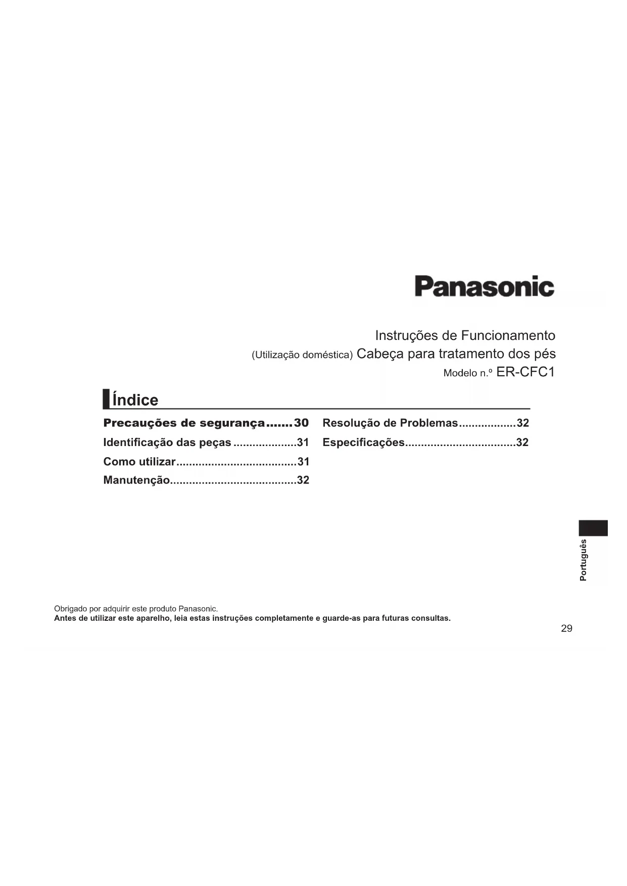- O tempo de vida útil da lima é de aproximadamente 1 ano (assumindo uma utilização única a cada 2 semanas, com cerca de 10 minutos por utilização). Resolução de Problemas Problema AçãoO aparelho não funciona.Volte a instalar o chassis.O aparelho para durante o funcionamento.Exerça uma pressão suave no contacto do aparelho com a pele.Não é possível limar.A lima está gasta. Contacte um centro de assistência autorizado e adquire uma. O cheiro não desaparece.Embeba a lima em água durante aproximadamente 24 horas antes de lavar.Se mesmo assim não for possível resolver os problemas, contacte o seu vendedor ou um centro de assistência autorizado pela Panasonic para reparação. Especicações Ruído aéreo 65 (dB (A) re 1 pW) Este produto foi concebido apenas para utilização doméstica.33 Svenska Bruksanvisning (Hushållsbruk) Fotvårdshuvud Modellnr. ER‑CFC1 Tack för att du köpt denna produkt från Panasonic.Läs igenom denna bruksanvisning noga innan du börjar använda apparaten. Spara bruksanvisningen för framtida bruk. Säkerhetsföreskrifter 34 Identiering av delar .........................35 Användning ........................................ 35 Underhåll ............................................36 Felsökning ..........................................36 Specikationer ................................... 36 Innehåll34 Svenska VARNING
