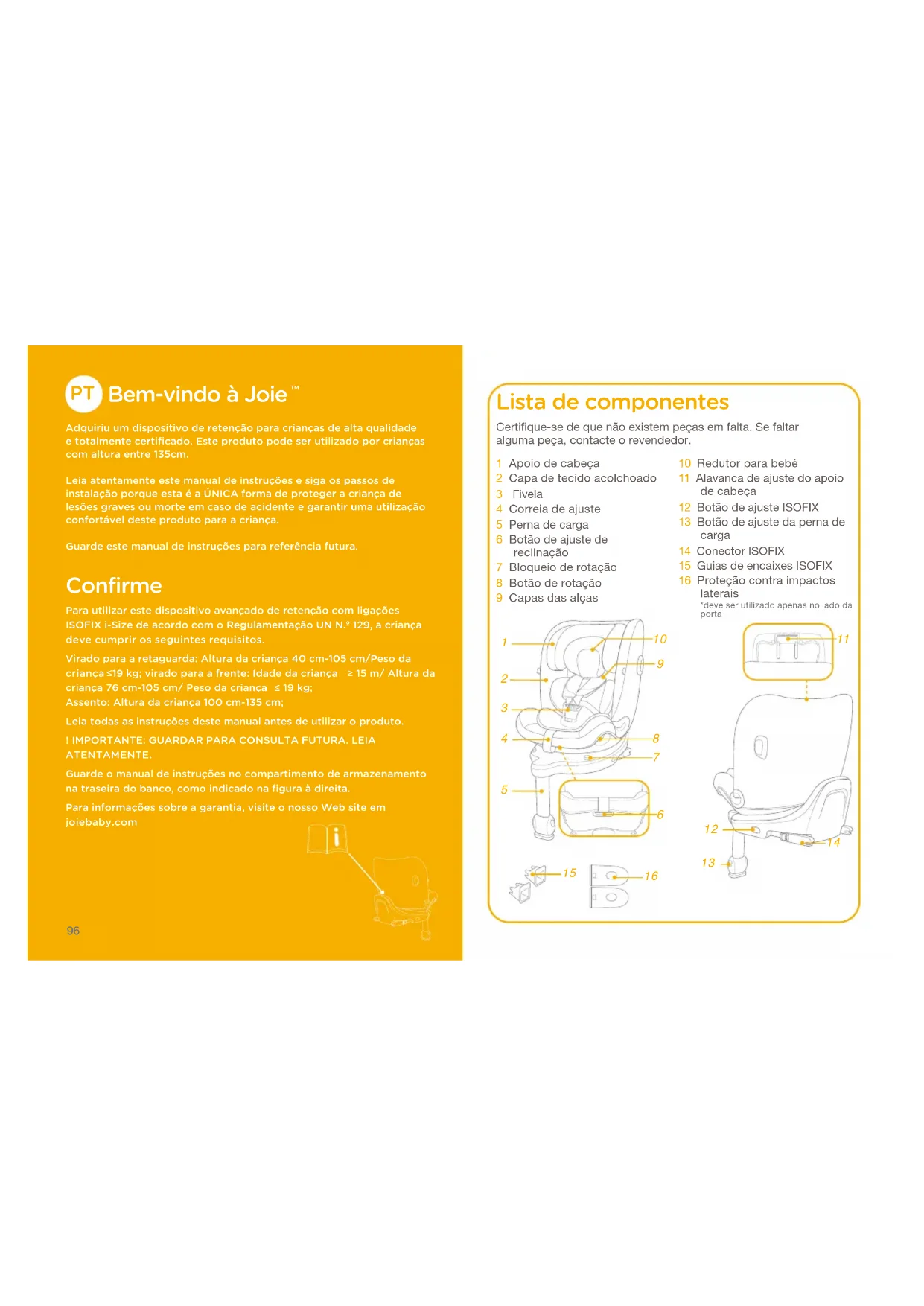 Adquiriu um dispositivo de retenção para crianças de alta qualidade e totalmente certificado. Este produto pode ser utilizado por crianças com altura entre 135cm.Leia atentamente este manual de instruções e siga os passos de instalação porque esta é a ÚNICA forma de proteger a criança de lesões graves ou morte em caso de acidente e garantir uma utilização confortável deste produto para a criança.Guarde este manual de instruções para referência futura. Confirme Para utilizar este dispositivo avançado de retenção com ligações ISOFIX i-Size de acordo com o Regulamentação UN N.º 129﹐ a criança deve cumprir os seguintes requisitos.Virado para a retaguarda: Altura da criança 40 cm-105 cm/Peso da criança 19 kg; virado para a frente: Idade da criança 15 m/ Altura da criança 76 cm-105 cm/ Peso da criança 19 kg; Assento: Altura da criança 100 cm-135 cm;Leia todas as instruções deste manual antes de utilizar o produto.! IMPORTANTE: GUARDAR PARA CONSULTA FUTURA. LEIA ATENTAMENTE.Guarde o manual de instruções no compartimento de armazenamento na traseira do banco﹐ como indicado na figura à direita. Para informações sobre a garantia﹐ visite o nosso Web site em joiebaby.com Lista de componentes 1 Apoio de cabeça2 Capa de tecido acolchoado3 Fivela4 Correia de ajuste5 Perna de carga6 Botão de ajuste de reclinação7 Bloqueio de rotação8 Botão de rotação9 Capas das alças10 Redutor para bebé11 Alavanca de ajuste do apoio de cabeça12 Botão de ajuste ISOFIX13 Botão de ajuste da perna de carga14 Conector ISOFIX15 Guias de encaixes ISOFIX16 Proteção contra impactos laterais*deve ser utilizado apenas no lado da portaCertifique-se de que não existem peças em falta. Se faltar alguma peça, contacte o revendedor.