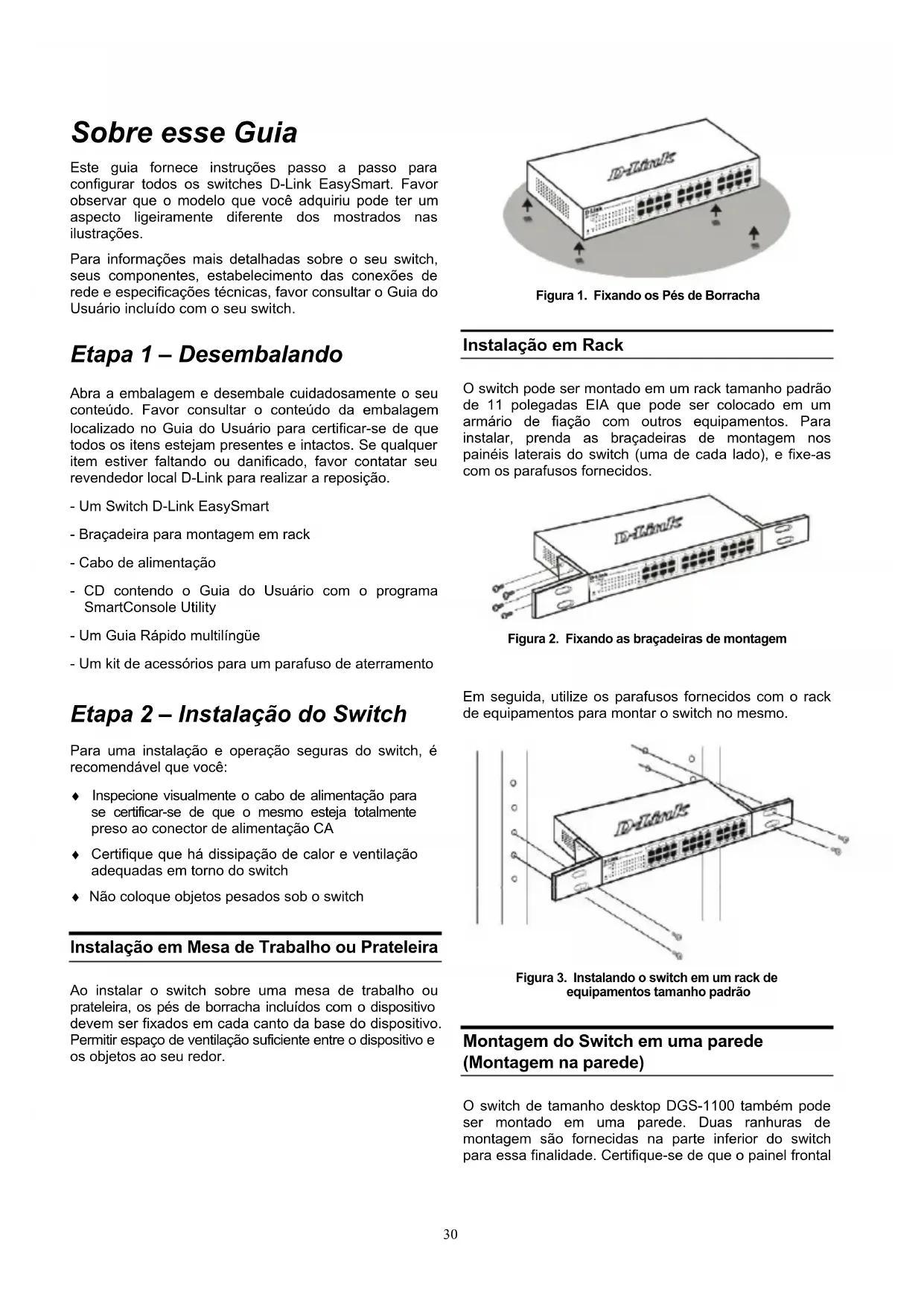 SmartConsole Utility 尋找智慧型交換器。 關於SmartConsole更詳細的功能,請參閱使用手冊中的 Smart Wizard文件說明。2930 Sobre esse Guia Este guia fornece instruções passo a passo para configurar todos os switches D-Link EasySmart. Favor observar que o modelo que você adquiriu pode ter um aspecto ligeiramente diferente dos mostrados nas ilustrações. Para informações mais detalhadas sobre o seu switch, seus componentes, estabelecimento das conexões de rede e especificações técnicas, favor consultar o Guia do Usuário incluído com o seu switch. Etapa 1 – Desembalando Abra a embalagem e desembale cuidadosamente o seu conteúdo. Favor consultar o conteúdo da embalagem localizado no Guia do Usuário para certificar-se de que todos os itens estejam presentes e intactos. Se qualquer item estiver faltando ou danificado, favor contatar seu revendedor local D-Link para realizar a reposição. - Um Switch D-Link EasySmart - Braçadeira para montagem em rack - Cabo de alimentação - CD contendo o Guia do Usuário com o programa SmartConsole Utility - Um Guia Rápido multilíngüe - Um kit de acessórios para um parafuso de aterramento Etapa 2 – Instalação do Switch Para uma instalação e operação seguras do switch, é recomendável que você: ♦ Inspecione visualmente o cabo de alimentação para se certificar-se de que o mesmo esteja totalmente preso ao conector de alimentação CA ♦ Certifique que há dissipação de calor e ventilação adequadas em torno do switch ♦ Não coloque objetos pesados sob o switch Instalação em Mesa de Trabalho ou Prateleira Ao instalar o switch sobre uma mesa de trabalho ou prateleira, os pés de borracha incluídos com o dispositivo devem ser fixados em cada canto da base do dispositivo. Permitir espaço de ventilação suficiente entre o dispositivo e os objetos ao seu redor. Figura 1. Fixando os Pés de Borracha Instalação em Rack O switch pode ser montado em um rack tamanho padrão de 11 polegadas EIA que pode ser colocado em um armário de fiação com outros equipamentos. Para instalar, prenda as braçadeiras de montagem nos painéis laterais do switch (uma de cada lado), e fixe-as com os parafusos fornecidos. Figura 2. Fixando as braçadeiras de montagem Em seguida, utilize os parafusos fornecidos com o rack de equipamentos para montar o switch no mesmo. Figura 3. Instalando o switch em um rack de equipamentos tamanho padrão Montagem do Switch em uma parede (Montagem na parede) O switch de tamanho desktop DGS-1100 também pode ser montado em uma parede. Duas ranhuras de montagem são fornecidas na parte inferior do switch para essa finalidade. Certifique-se de que o painel frontal31 esteja exposto para permitir que você veja os LEDs. Favor consultar as ilustrações abaixo: A.) Montagem em uma parede de concreto
