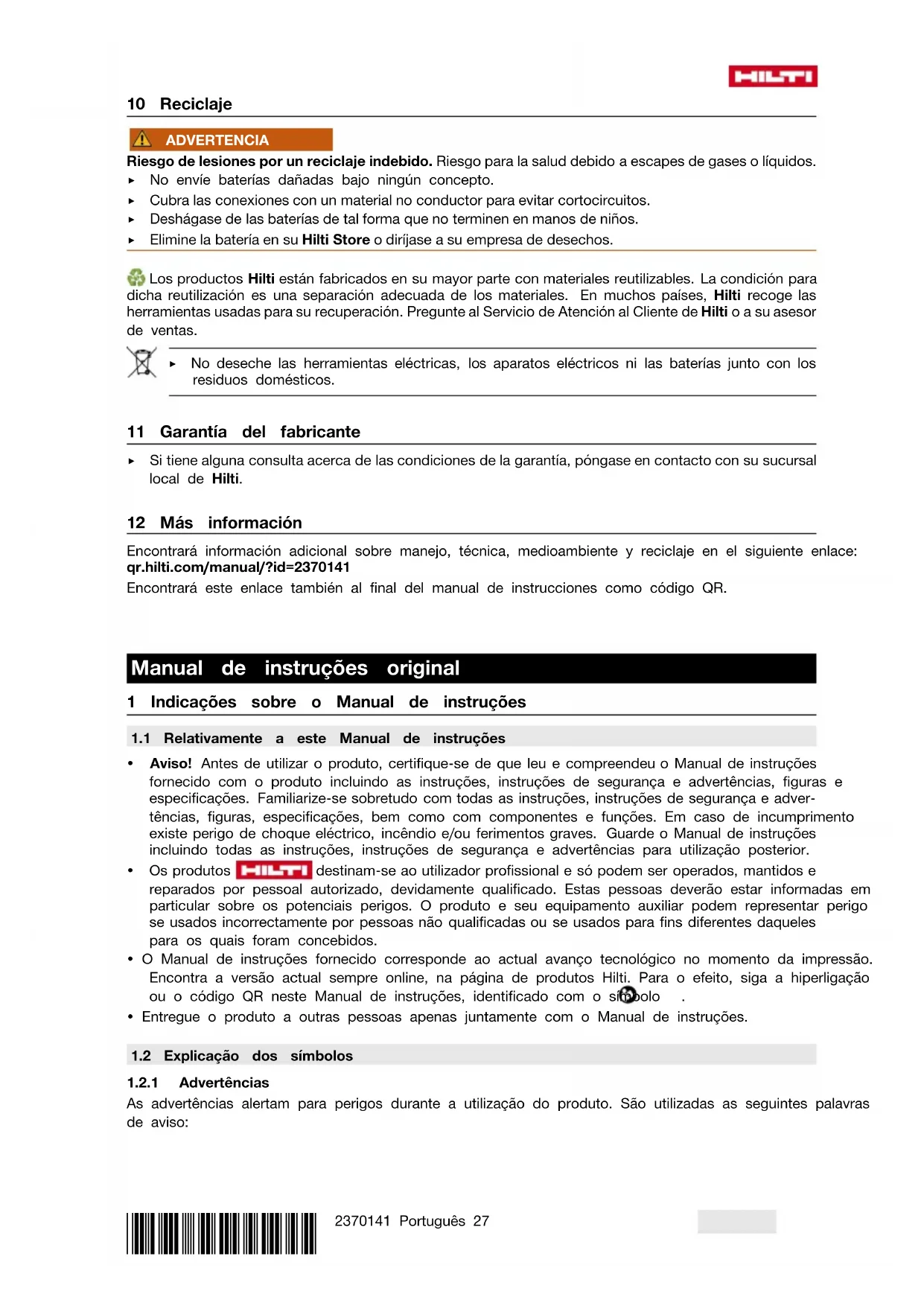 Pode consultar informacoes mais pormenorizadas sobre Utilização, Tecnologia, Meio ambiente e Recicagem na segunte hyperlingação: qr.hilti.com/manual/?id=2370141