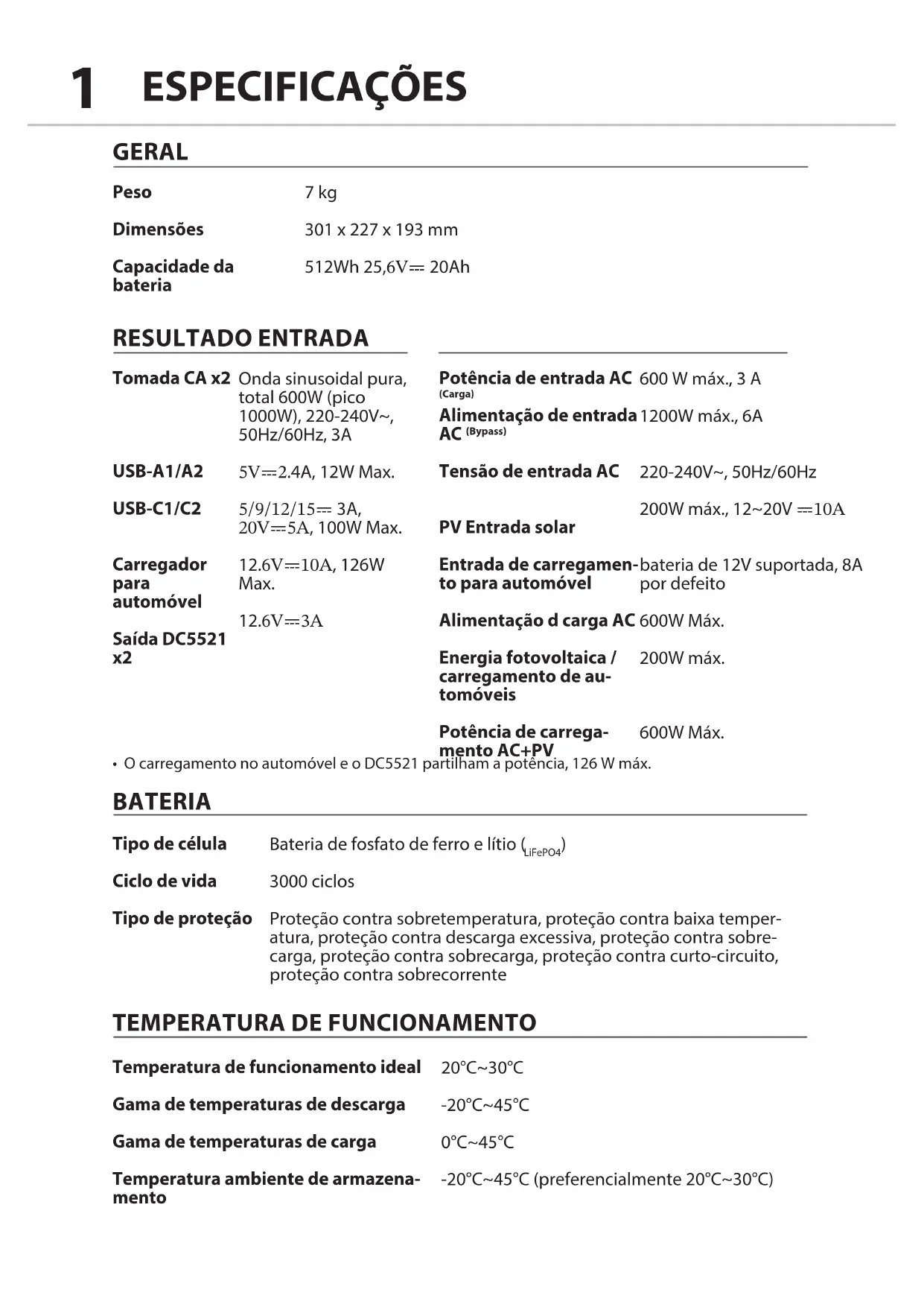 3000 ciclos Proteção contra sobretemperatura, proteção contra baixa temper- atura, proteção contra descarga excessiva, proteção contra sobre- carga, proteção contra sobrecarga, proteção contra curto-circuito, proteção contra sobrecorrente 20°C~30°C -20°C~45°C 0°C~45°C -20°C~45°C (preferencialmente 20°C~30°C) 600 W máx., 3 A 1200W máx., 6A 220-240V~, 50Hz/60Hz 200W máx., 12~20V ⎓10A bateria de 12V suportada, 8A por defeito 600W Máx. 200W máx. 600W Máx.