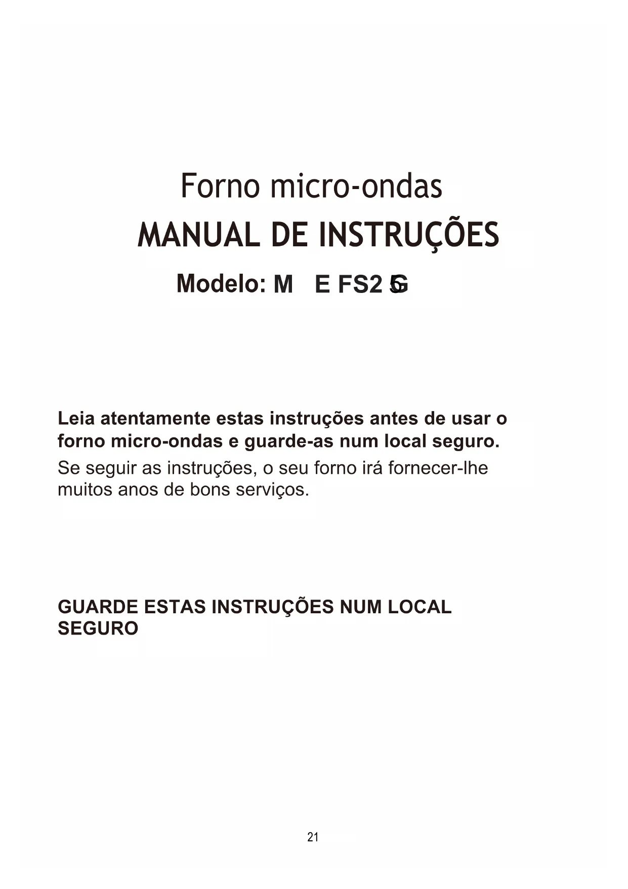 Modelo: Leia atentamente estas instruções antes de usar o forno micro-ondas e guarde-as num local seguro. Se seguir as instruções, o seu forno irá fornecer-lhe muitos anos de bons serviços.