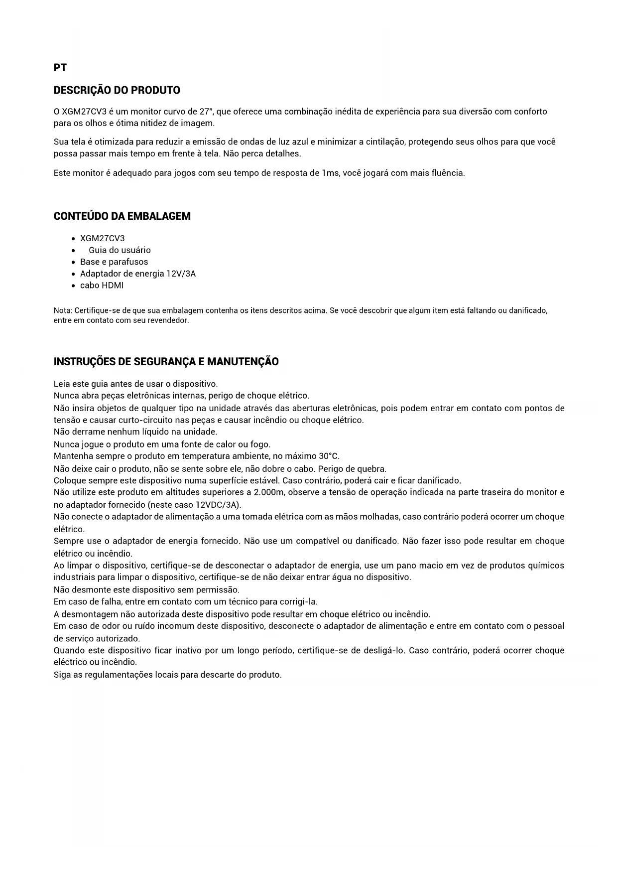 MANUAL DE UTILIZADOR XGM27CV3 KeepOut