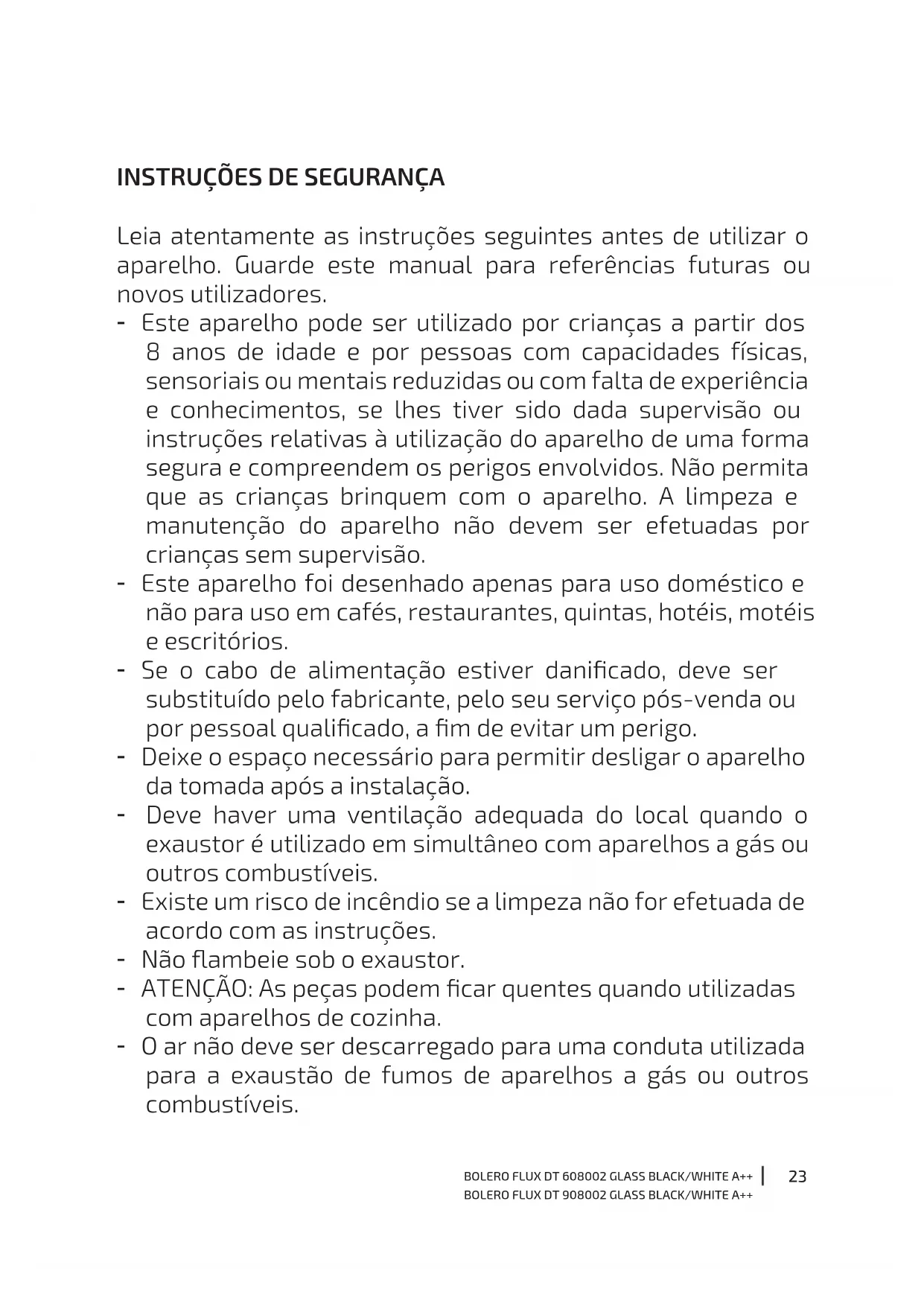 Leia atentamente as instruções seguintes antes de utilizar o aparelho. Guarde este manual para referências futuras ou novos utilizadores. - Este aparelho pode ser utilizado por crianças a partir dos 8 anos de idade e por pessoas com capacidades físicas, sensoriais ou mentais reduzidas ou com falta de experiência e conhecimentos, se lhes tiver sido dada supervisão ou instruções relativas à utilização do aparelho de uma forma segura e compreendem os perigos envolvidos. Não permita que as crianças brinquem com o aparelho. A limpeza e manutenção do aparelho não devem ser efetuadas por crianças sem supervisão. - Este aparelho foi desenhado apenas para uso doméstico e não para uso em cafés, restaurantes, quintas, hotéis, motéis e escritórios. - Se o cabo de alimentação estiver danicado, deve ser substituído pelo fabricante, pelo seu serviço pós-venda ou por pessoal qualicado, a m de evitar um perigo. - Deixe o espaço necessário para permitir desligar o aparelho da tomada após a instalação. - Deve haver uma ventilação adequada do local quando o exaustor é utilizado em simultâneo com aparelhos a gás ou outros combustíveis. - Existe um risco de incêndio se a limpeza não for efetuada de acordo com as instruções. - Não ambeie sob o exaustor. - ATENÇÃO: As peças podem car quentes quando utilizadas com aparelhos de cozinha. - O ar não deve ser descarregado para uma conduta utilizada para a exaustão de fumos de aparelhos a gás ou outros combustíveis.24 BOLERO FLUX DT 608002 GLASS BLACK/WHITE A++ BOLERO FLUX DT 908002 GLASS BLACK/WHITE A++ - A distância mínima entre a superfície de apoio dos recipientes de cozedura na bancada e a parte mais baixa do exaustor, quando este se encontra por cima de um aparelho a gás, deve ser de pelo menos 65 cm. Se as instruções de instalação do fogão a gás indicarem uma distância maior, esta deve ser tida em conta. A distância de 65 cm pode reduzir-se para: