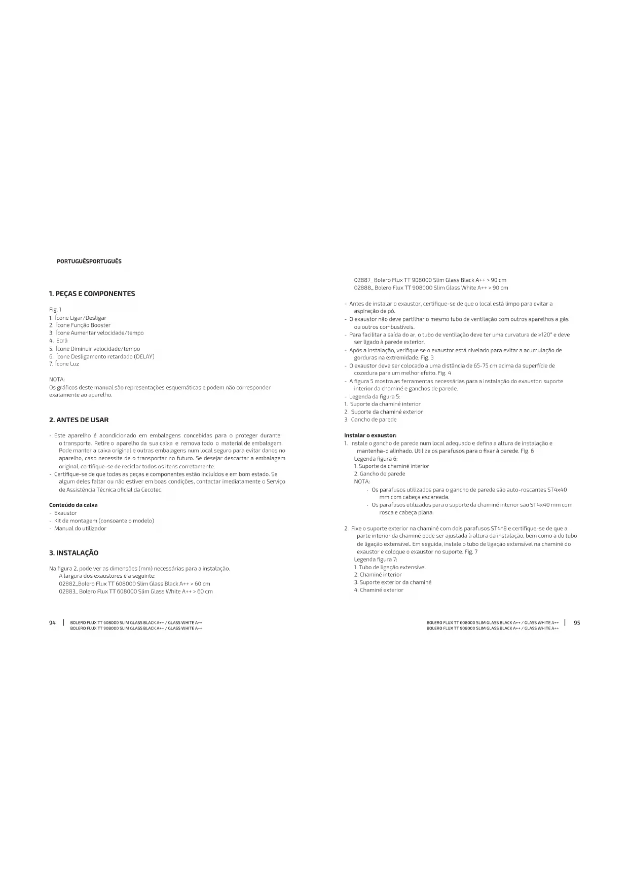 Leia atentamente as instruções seguintes antes de utilizar o aparelho. Guarde este manual para referências futuras ou novos utilizadores. Este aparelho pode ser utilizado por crianças a partir dos 8 anos de idade e por pessoas com capacidades físicas,2726 BOLERO FLUX TT 608000 SLIM GLASS BLACK A++ / GLASS WHITE A++ BOLERO FLUX TT 908000 SLIM GLASS BLACK A++ / GLASS WHITE A++ BOLERO FLUX TT 608000 SLIM GLASS BLACK A++ / GLASS WHITE A++ BOLERO FLUX TT 908000 SLIM GLASS BLACK A++ / GLASS WHITE A++ Remova cuidadosamente o material de embalagem. Este é perigoso para as crianças. Tenha atenção às bordas aadas no interior do exaustor, especialmente durante a instalação e a limpeza. Certique-se de que a conduta não tem curvas mais acentuadas do que 90º, pois isso reduzirá a eciência do exaustor. Advertência: A não instalação dos parafusos ou do aparelho de acordo com estas instruções pode resultar em riscos elétricos. Advertência: Antes de aceder aos terminais elétricos, todos os circuitos de alimentação elétrica devem ser desligados. Deve haver uma ventilação adequada do local quando o exaustor é utilizado em simultâneo com aparelhos a gás ou outros combustíveis. Precaução: O aparelho e as suas partes acessíveis cam quentes durante a sua utilização. Tenha cuidado para não tocar nas partes acessíveis. As crianças com menos de 8 anos de idade devem ser mantidas afastadas, a menos que estejam sob supervisão. Os regulamentos locais relativos à descarga de ar devem ser cumpridos. Por razões de segurança, utilize apenas os parafusos de xação ou de montagem fornecidos (se aplicável, consoante o modelo) ou do mesmo tamanho que se recomendam neste manual de instruções. Não utilize um aparelho de limpeza a vapor. Nunca tentar apagar um incêndio com água, desligar o aparelho e cobrir a chama, por exemplo, com uma tampa ou um cobertor de incêndio. Nunca utilize cabos de extensão, ligações de tomadas múltiplas ou elementos externos de ligação do temporizador.