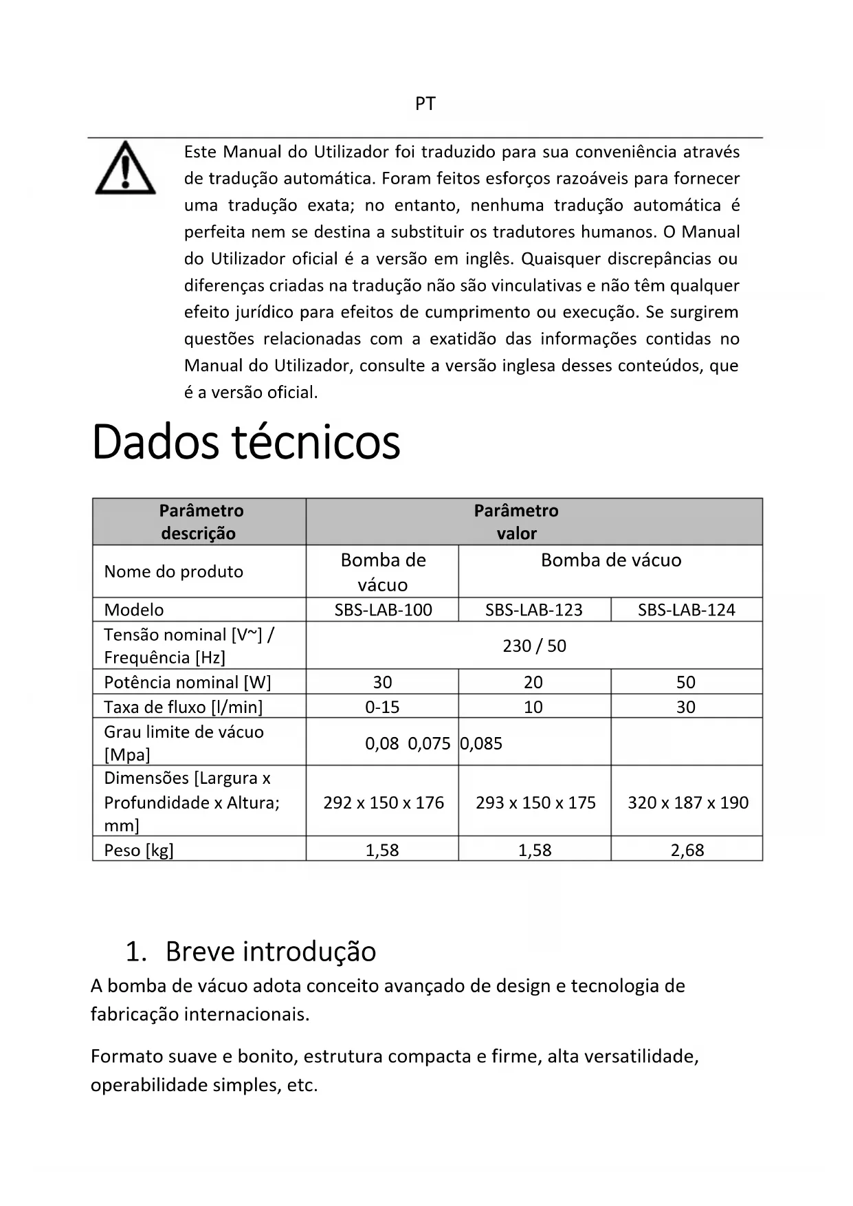 Este Manual do Utilizador foi traduzido para sua conveniência através de tradução automática. Foram feitos esforços razoáveis para fornecer uma tradução exata; no entanto, nenhuma tradução automática é perfeita nem se destina a substituir os tradutores humanos. O Manual do Utilizador oficial é a versão em inglês. Quaisquer discrepâncias ou diferenças criadas na tradução não são vinculativas e não têm qualquer efeito jurídico para efeitos de cumprimento ou execução. Se surgirem questões relacionadas com a exatidão das informações contidas no Manual do Utilizador, consulte a versão inglesa desses conteúdos, que é a versão oficial. Dados técnicos Parâmetro descrição Parâmetro valor Nome do produto Bomba de vácuo Bomba de vácuo Modelo SBS-LAB-100 SBS-LAB-123 SBS-LAB-124 Tensão nominal [V~] / Frequência [Hz] 230 / 50 Potência nominal [W]