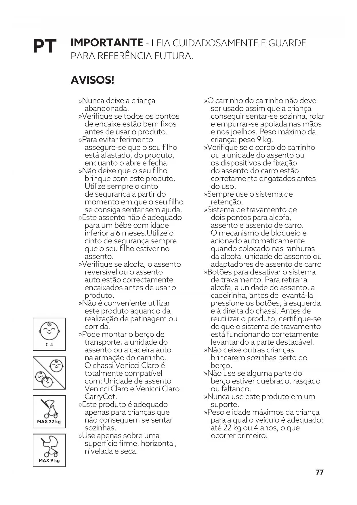 PARA REFERÊNCIA FUTURA. AVISOS! » Nunca deixe a criança abandonada. » Verifique se todos os pontos de encaixe estão bem fixos antes de usar o produto. » Para evitar ferimento assegure-se que o seu filho está afastado, do produto, enquanto o abre e fecha. » Não deixe que o seu filho brinque com este produto. Utilize sempre o cinto de segurança a partir do momento em que o seu filho se consiga sentar sem ajuda. » Este assento não é adequado para um bébé com idade inferior a 6 meses.Utilize o cinto de segurança sempre que o seu filho estiver no assento. » Verifique se alcofa, o assento reversível ou o assento auto estão correctamente encaixados antes de usar o produto. » Não é conveniente utilizar este produto aquando da realização de patinagem ou corrida. » Pode montar o berço de transporte, a unidade do assento ou a cadeira auto na armação do carrinho. O chassi Venicci Claro é totalmente compatível com: Unidade de assento Venicci Claro e Venicci Claro CarryCot. » Este produto é adequado apenas para crianças que não conseguem se sentar sozinhas. » Use apenas sobre uma superfície firme, horizontal, nivelada e seca. » O carrinho do carrinho não deve ser usado assim que a criança conseguir sentar-se sozinha, rolar e empurrar-se apoiada nas mãos e nos joelhos. Peso máximo da criança: peso 9 kg. » Verifique se o corpo do carrinho ou a unidade do assento ou os dispositivos de fixação do assento do carro estão corretamente engatados antes do uso. » Sempre use o sistema de retenção. » Sistema de travamento de dois pontos para alcofa, assento e assento de carro. O mecanismo de bloqueio é acionado automaticamente quando colocado nas ranhuras da alcofa, unidade de assento ou adaptadores de assento de carro » Botões para desativar o sistema de travamento. Para retirar a alcofa, a unidade do assento, a cadeirinha, antes de levantá-la pressione os botões, à esquerda e à direita do chassi. Antes de reutilizar o produto, certifique-se de que o sistema de travamento está funcionando corretamente levantando a parte destacável. » Não deixe outras crianças brincarem sozinhas perto do berço. » Não use se alguma parte do berço estiver quebrado, rasgado ou faltando. » Nunca use este produto em um suporte. » Peso e idade máximos da criança para a qual o veículo é adequado: até 22 kg ou 4 anos, o que ocorrer primeiro.78