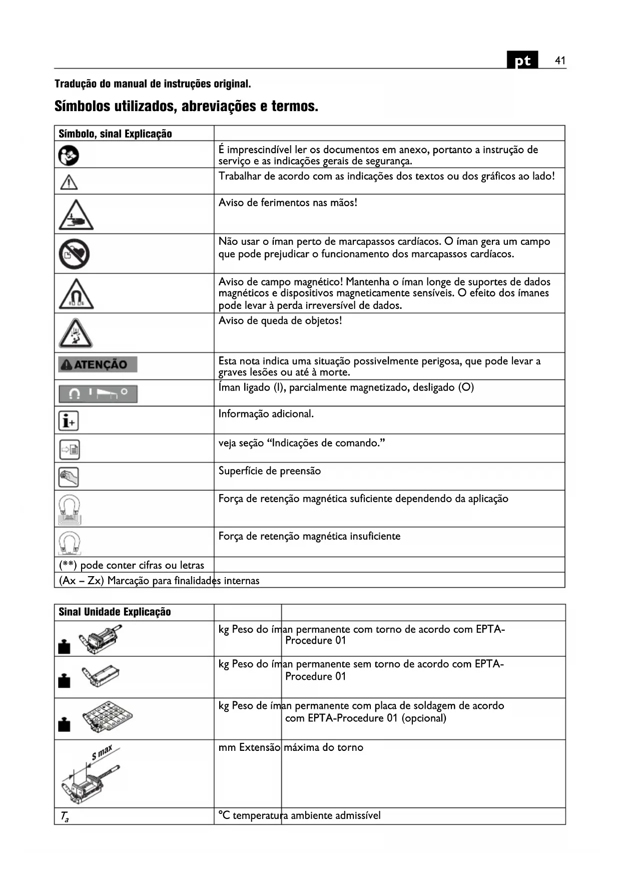 Tradução do manual de instruções original. Símbolos utilizados, abreviações e termos. Símbolo, sinal Explicação É imprescindível ler os documentos em anexo, portanto a instrução de serviço e as indicações gerais de segurança. Trabalhar de acordo com as indicações dos textos ou dos gráficos ao lado! Aviso de ferimentos nas mãos! Não usar o íman perto de marcapassos cardíacos. O íman gera um campo que pode prejudicar o funcionamento dos marcapassos cardíacos. Aviso de campo magnético! Mantenha o íman longe de suportes de dados magnéticos e dispositivos magneticamente sensíveis. O efeito dos ímanes pode levar à perda irreversível de dados. Aviso de queda de objetos! Esta nota indica uma situação possivelmente perigosa, que pode levar a graves lesões ou até à morte. Íman ligado (I), parcialmente magnetizado, desligado (O) Informação adicional. veja seção “Indicações de comando.” Superfície de preensão Força de retenção magnética suficiente dependendo da aplicação Força de retenção magnética insuficiente (**) pode conter cifras ou letras (Ax – Zx) Marcação para finalidades internas Sinal Unidade Explicação kg Peso do íman permanente com torno de acordo com EPTA- Procedure 01 kg Peso do íman permanente sem torno de acordo com EPTA- Procedure 01 kg Peso de íman permanente com placa de soldagem de acordo com EPTA-Procedure 01 (opcional) mm Extensão máxima do torno