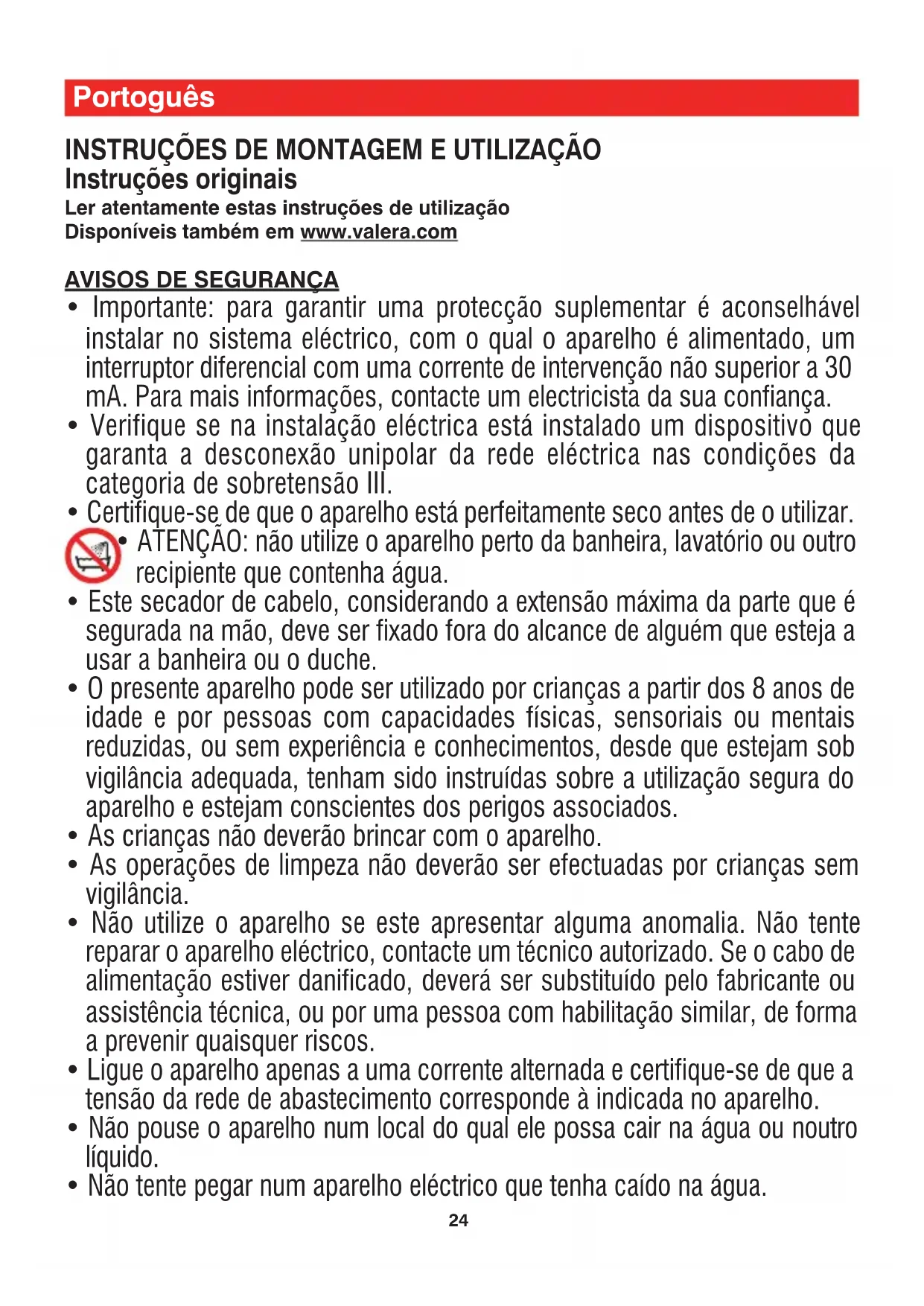 - O nível de pressão sonora para os secadores de cabelos de uso comercial é inferior a 70 dB(A). 00060814 int 2021_01_Layout 1 26/01/2021 10:22 Pagina 2526 O símbolo no produto ou na embalagem indica que este produto não pode ser tratado como lixo doméstico. Em vez disso deve ser entregue ao centro de recolha selectiva para a reciclagem de equipamento eléctrico e electrónico. Ao garantir uma eliminação adequada deste produto, irá ajudar a evitar eventuais consequências negativas para o meio ambiente e para a saúde pública, que, de outra forma, poderiam ser provocadas por um tratamento incorrecto do produto. Para obter informações mais pormenorizadas sobre a reciclagem deste produto, contacte os serviços municipalizados locais, o centro de recolha selectiva da sua área de residência ou o estabelecimento onde adquiriu o produto. VALERA é marca registrada da Ligo Electric S.A. - Suíça GARANTIA O fabricante VALERA garante o aparelho desde que observadas as seguintes condições: