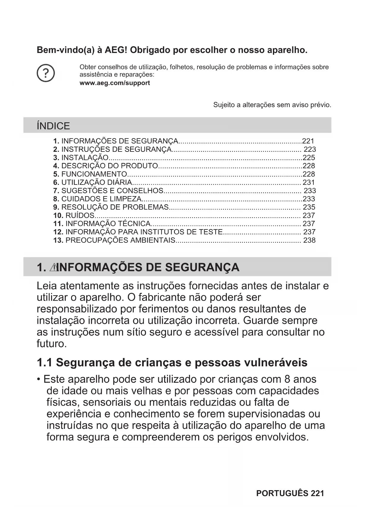 Recicle os materiais que apresentem o símbolo . Coloque a embalagem nos contentores indicados para reciclagem. Ajude a proteger o ambiente e a saúde pública através da reciclagem dos aparelhos eléctricos e electrónicos. Não elimine os aparelhos que tenham o símbolo juntamente com os resíduos domésticos. Coloque o produto num ponto de recolha para reciclagem local ou contacte as suas autoridades municipais. 238 PORTUGUÊSBine ați venit la AEG! Vă mulțumim pentru că ați ales produsul nostru. A găsi sfaturi privind utilizarea, broșuri, informații pentru depanare, service și reparații:www.aeg.com/supportNe rezervãm dreptul asupra efectuãrii de modificãri. CUPRINS