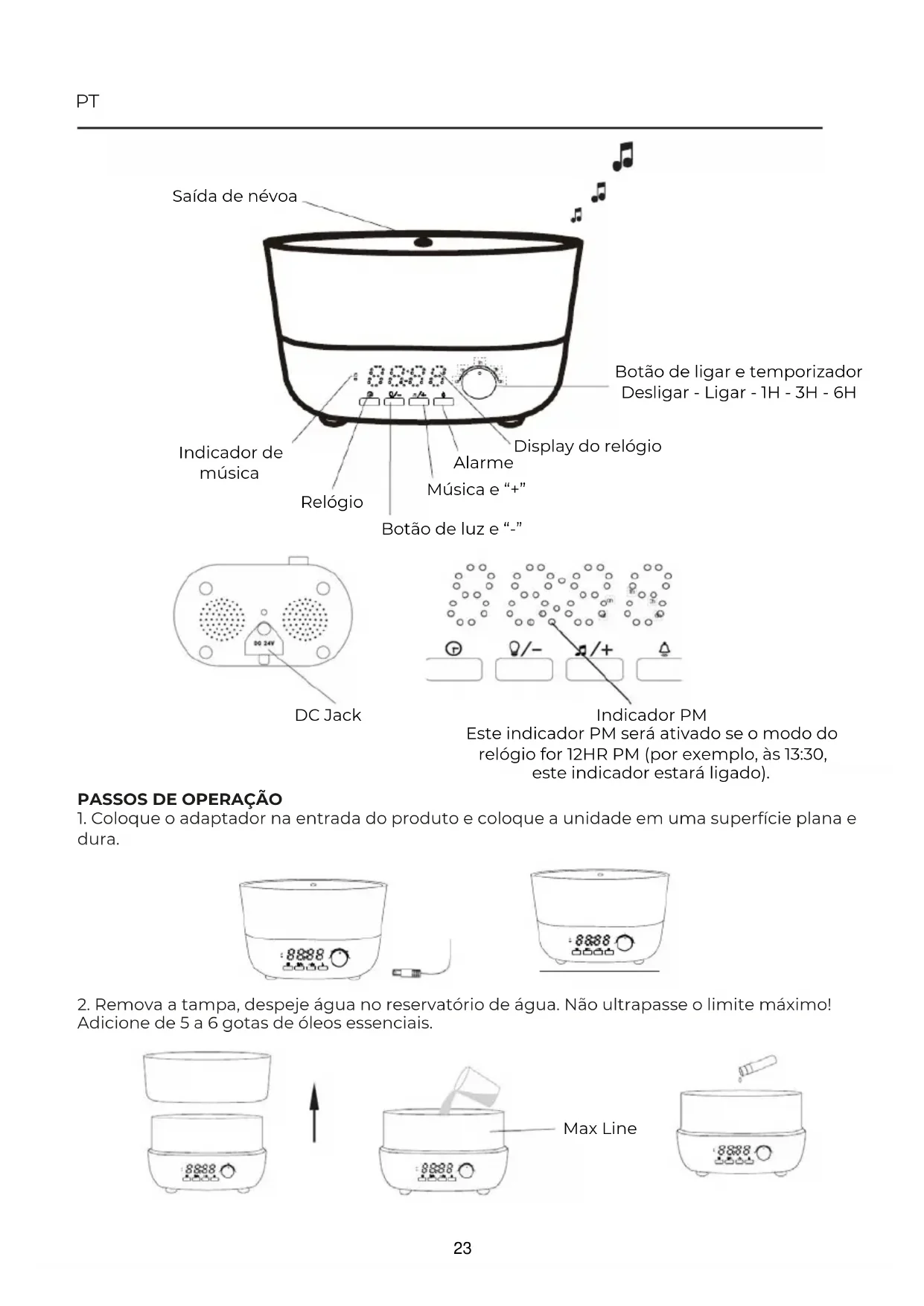 Adicione de 5 a 6 gotas de óleos essenciais. Indicador de música Relógio Botão de luz e “-” Música e “+” Alarme Display do relógio Saída de névoa Botão de ligar e temporizador Desligar - Ligar - 1H - 3H - 6H DC Jack Indicador PM Este indicador PM será ativado se o modo do relógio for 12HR PM (por exemplo, às 13:30, este indicador estará ligado). Max Line