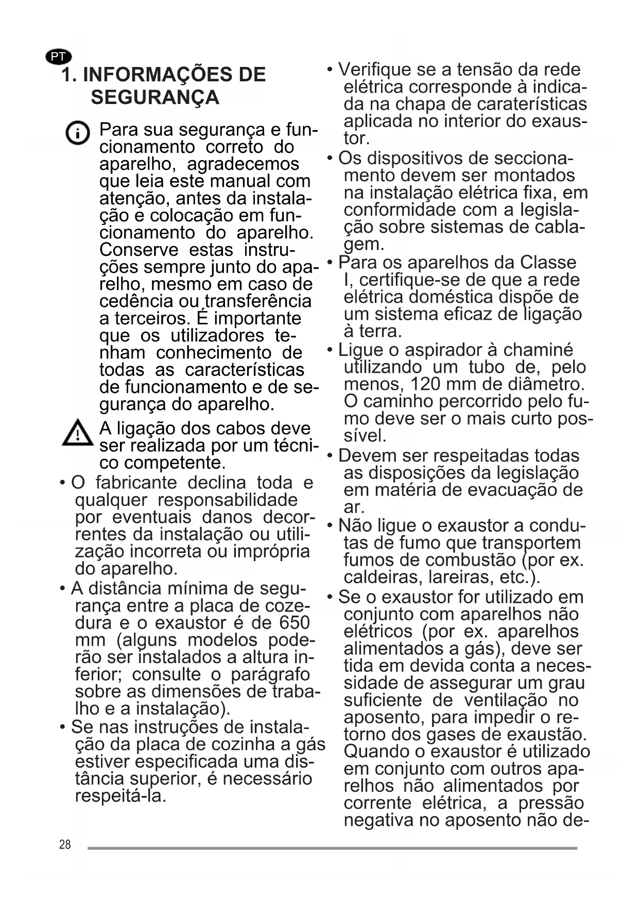 SEGURANÇA Para sua segurança e fun- cionamento correto do aparelho, agradecemos que leia este manual com atenção, antes da instala- ção e colocação em fun- cionamento do aparelho. Conserve estas instru- ções sempre junto do apa- relho, mesmo em caso de cedência ou transferência a terceiros. É importante que os utilizadores te- nham conhecimento de todas as características de funcionamento e de se- gurança do aparelho. A ligação dos cabos deve ser realizada por um técni- co competente.