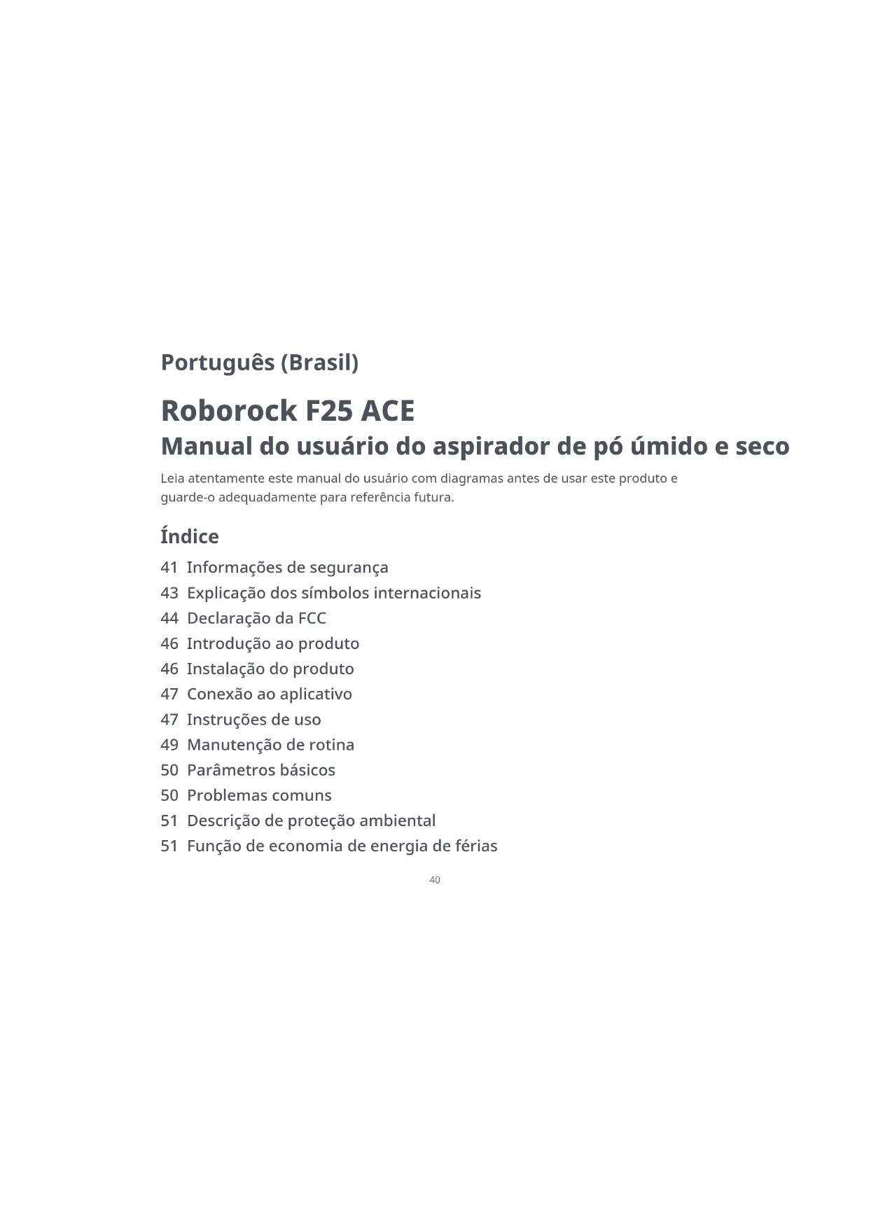 Roborock F25 ACE Manual do usuário do aspirador de pó úmido e seco Português (Brasil) Leia atentamente este manual do usuário com diagramas antes de usar este produto e guarde-o adequadamente para referência futura. Índice 41 Informações de segurança 43 Explicação dos símbolos internacionais 44 Declaração da FCC 46 Introdução ao produto 46 Instalação do produto 47 Conexão ao aplicativo 47 Instruções de uso 49 Manutenção de rotina 50 Parâmetros básicos 50 Problemas comuns 51 Descrição de proteção ambiental 51 Função de economia de energia de férias41