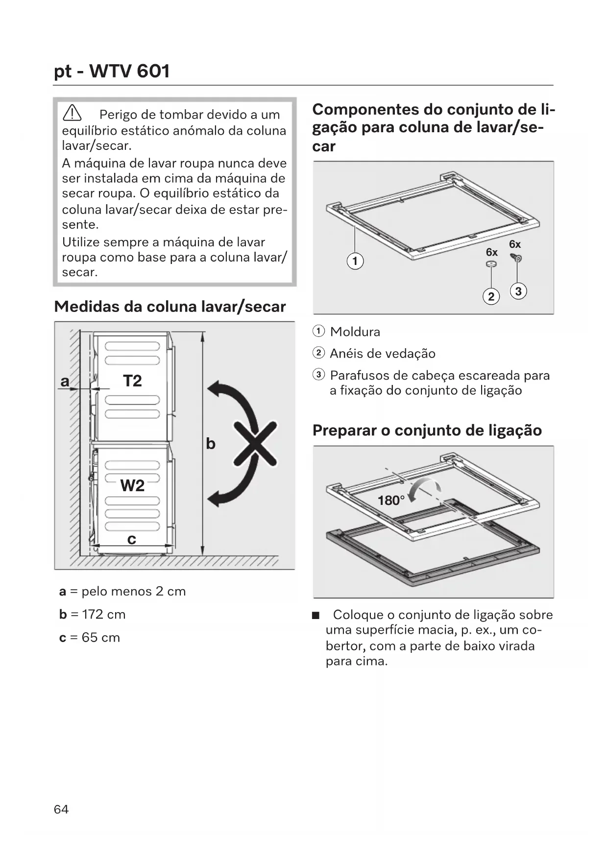 cjaliście. 63pt - WTV601 Perigo de tombar devido a um equilíbrio estático anómalo da coluna lavar/secar. A máquina de lavar roupa nunca deve ser instalada em cima da máquina de secar roupa. O equilíbrio estático da coluna lavar/secar deixa de estar pre- sente. Utilize sempre a máquina de lavar roupa como base para a coluna lavar/ secar. Medidas da coluna lavar/secar