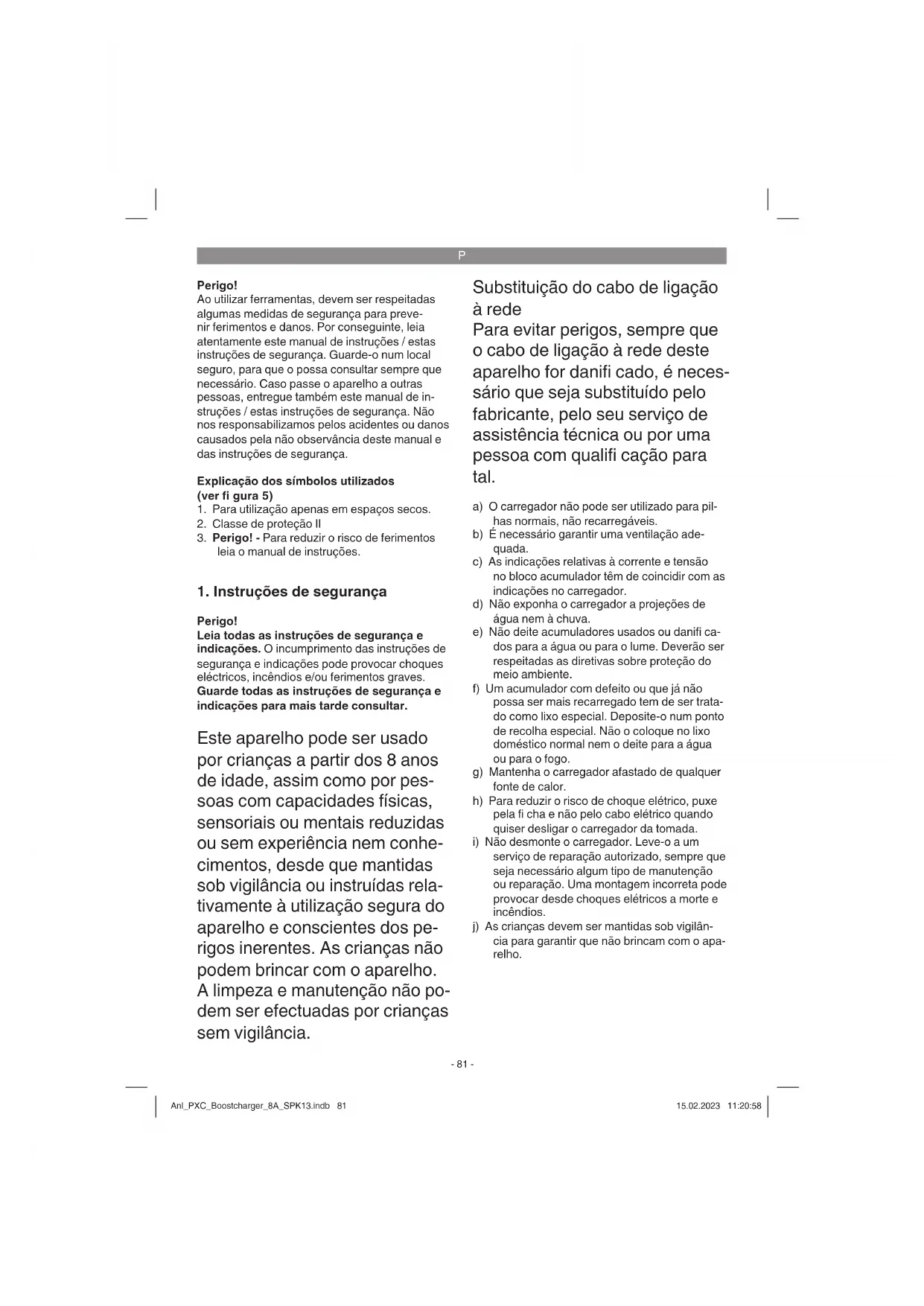 serviço de reparação autorizado, sempre que seja necessário algum tipo de manutenção ou reparação. Uma montagem incorreta pode provocar desde choques elétricos a morte e incêndios. j) As crianças devem ser mantidas sob vigilân- cia para garantir que não brincam com o apa- relho. Anl_PXC_Boostcharger_8A_SPK13.indb 81Anl_PXC_Boostcharger_8A_SPK13.indb 81 15.02.2023 11:20:5815.02.2023 11:20:58P