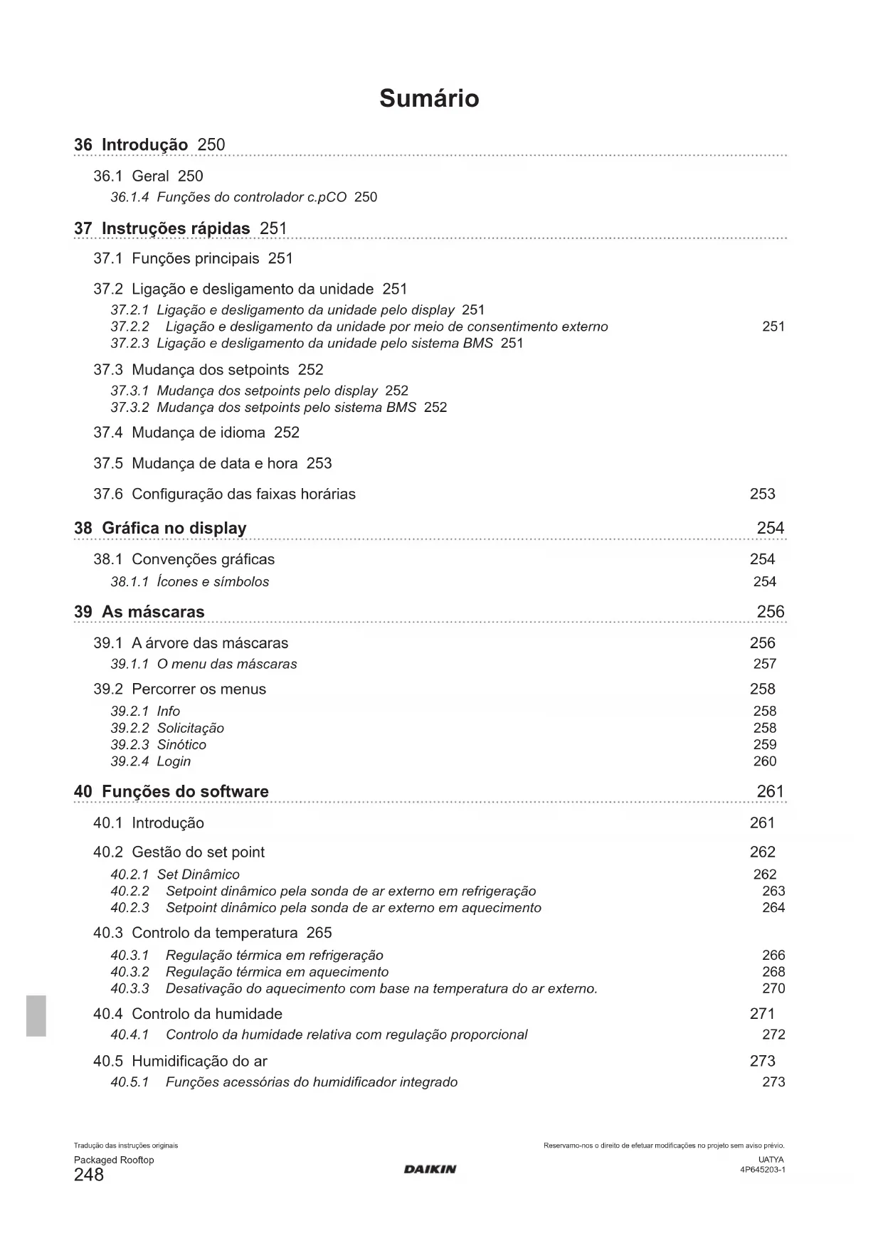 - -Tradução das instruções originaisPackaged Rooftop Reservamo-nos o direito de efetuar modicações no projeto sem aviso prévio.UATYA4P645203-1 Sumário 36 Introdução 250