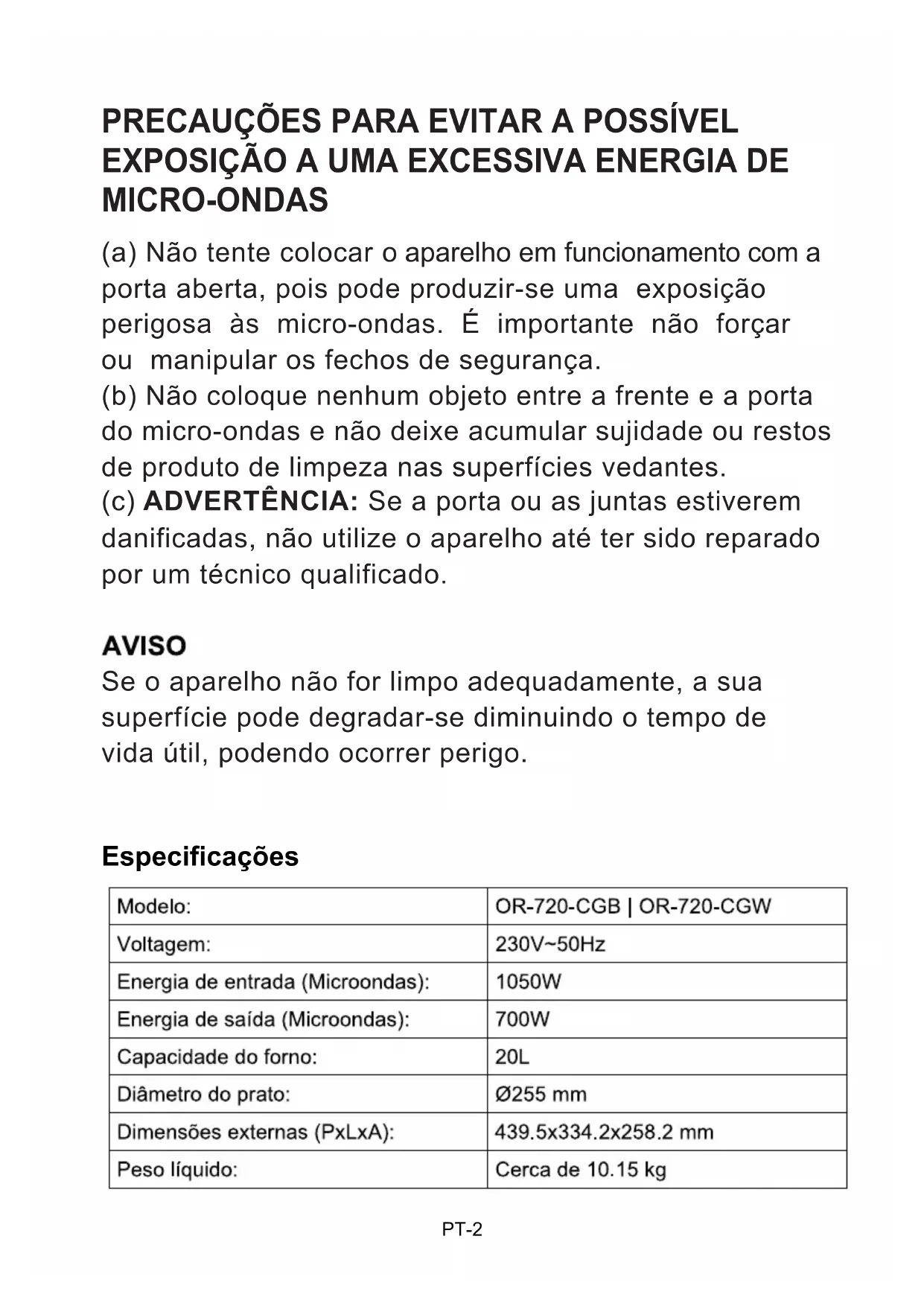 (a) Não tente colocar o aparelho em funcionamento com a porta aberta, pois pode produzir-se uma exposição perigosa às micro-ondas. É importante não forçar ou manipular os fechos de segurança. (b) Não coloque nenhum objeto entre a frente e a porta do micro-ondas e não deixe acumular sujidade ou restos de produto de limpeza nas superfícies vedantes. (c) ADVERTÊNCIA: Se a porta ou as juntas estiverem danificadas, não utilize o aparelho até ter sido reparado por um técnico qualificado. Se o aparelho não for limpo adequadamente, a sua superfície pode degradar-se diminuindo o tempo de vida útil, podendo ocorrer perigo. PRECAUÇÕES PARA EVITAR A POSSÍVEL EXPOSIÇÃO A UMA EXCESSIVA ENERGIA DE MICRO-ONDAS PT-2,QVWUXo}HVGHVHJXUDQoDLPSRUWDQWHV $'9(57Ç1&,$ 0ARA REDUZIR O RISCO DE INCäNDIO DESCARGAS EL£TRICASQUANDO SE UTILIZA O aparelho observe PRECAUÀµES BÖSICAS $WHQomR,¤QUIDOS OU OUTROS ALIMENTOSNâO DEVERâO SER AQUECIDOS EM RECIPIENTESHERMETICAMENTE FECHADOS POis PODEMEXPLODIR $WHQomR» PERIGOSO retirar a tampa desegurança que protege contra a exposiçãoàs micro-ondas.