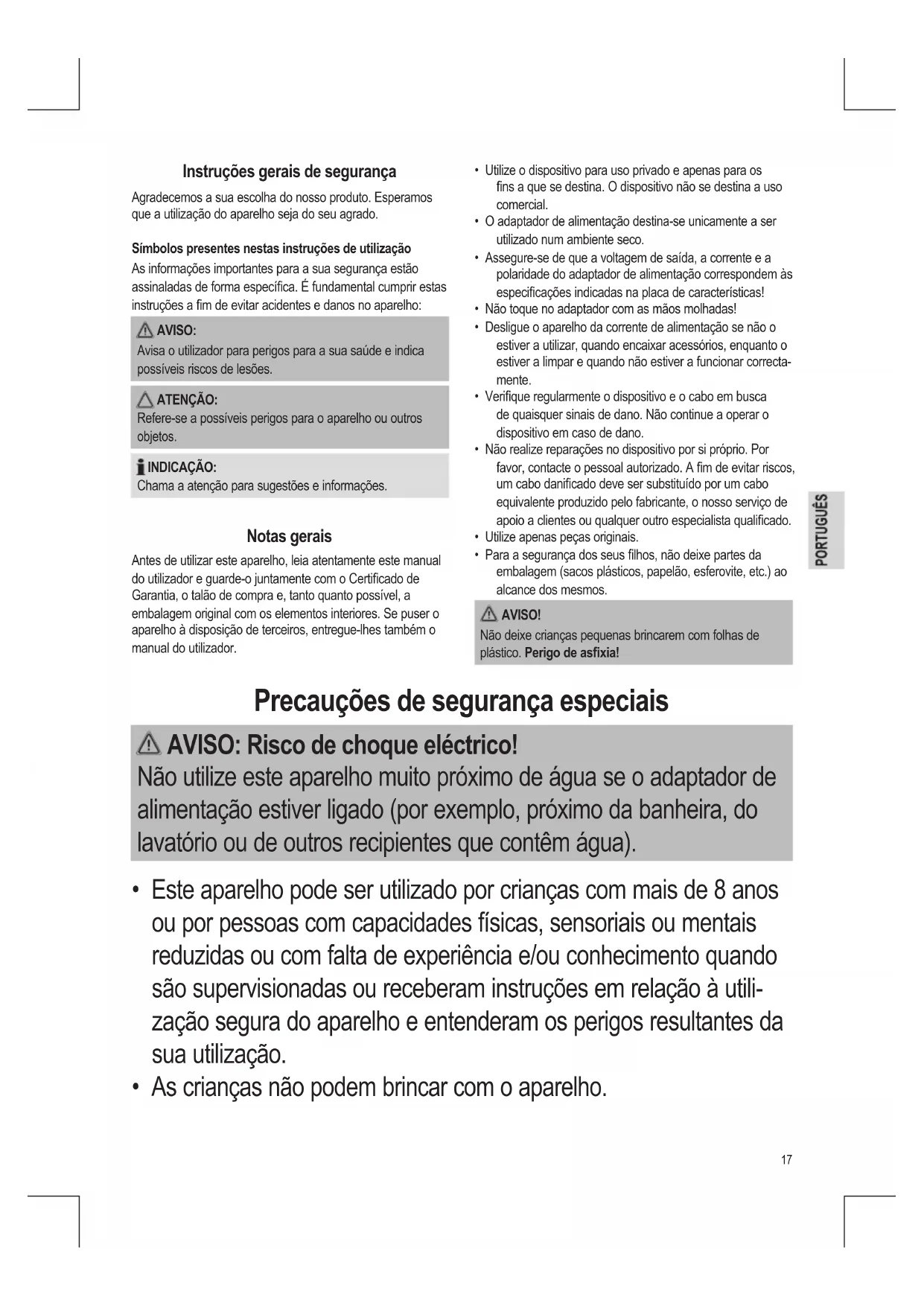 - Para a segurança dos seus lhos, não deixe partes da embalagem (sacos plásticos, papelão, esferovite, etc.) ao alcance dos mesmos. AVISO! Não deixe crianças pequenas brincarem com folhas de plástico. Perigo de asxia! Precauções de segurança especiais AVISO: Risco de choque eléctrico! Não utilize este aparelho muito próximo de água se o adaptador de alimentação estiver ligado (por exemplo, próximo da banheira, do lavatório ou de outros recipientes que contêm água).