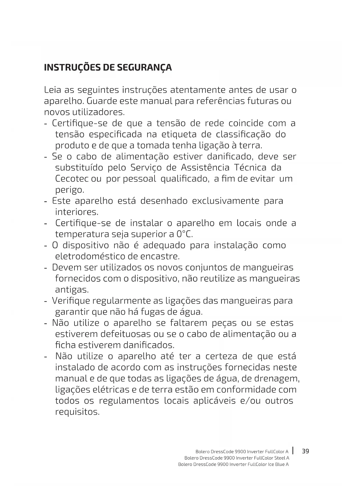 PORTUGUÊS A água drenada regressa ao aparelho. Se a extremidade da mangueira de descarga tocar na água drenada (água drenada da máquina de lavar), esta (a água descarregada) pode ser aspirada para dentro do aparelho e danicar o aparelho ou a roupa. O painel de controlo aquece. Trata-se de um ligeiro efeito de aquecimento dos componentes eletrónicos da placa de circuito impresso instalada na parte de trás do painel de controlo. Incidências gerais O seu aparelho contém sensores que monitorizam o progresso durante o ciclo de lavagem (por exemplo, nível de água, temperatura, cargas desequilibradas, tempo/ progresso da lavagem). Normalmente, se o seu aparelho concluir o ciclo com êxito, é pouco provável que exista um problema. - Não repare nem substitua qualquer peça do aparelho, excepto se tiver recebido instruções especícas para o fazer neste manual de instruções. Pode provocar a um incidente perigoso que ponha em perigo a sua saúde e/ou danique bens. - Em caso de avaria, contacte com o Serviço de Assistência Técnica de Cecotec. - Utilizar peças de substituição originais. IMPORTANTE: não entre em contacto com os seguintes componentes internos enquanto o aparelho estiver ligado: válvula(s) de entrada, bomba de drenagem, dissipador de calor do controlador do motor, PCB.Bolero DressCode 9900 Inverter FullColor A Bolero DressCode 9900 Inverter FullColor Steel A Bolero DressCode 9900 Inverter FullColor Ice Blue A
