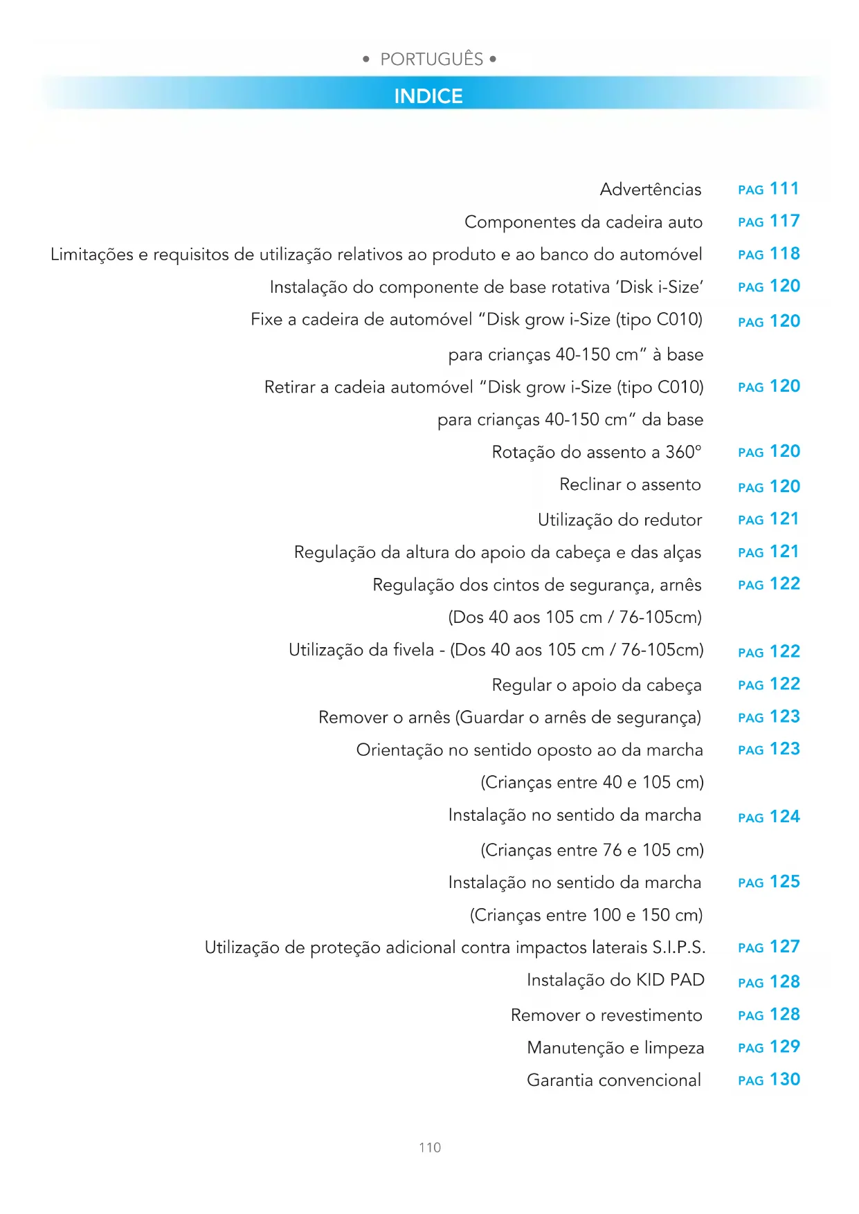 INDICE pag 111 pag 117 pag 118 pag 120 pag 120 pag 120 pag 120 pag 120 pag 121 pag 121 pag 122 pag 122 pag 122 pag 123 pag 123 pag 124 pag 125 pag 127 pag 128 pag 128 pag 129 pag 130 Advertências Componentes da cadeira auto Limitações e requisitos de utilização relativos ao produto e ao banco do automóvel Instalação do componente de base rotativa ‘Disk i-Size’ Fixe a cadeira de automóvel “Disk grow i-Size (tipo C010) para crianças 40-150 cm” à base Retirar a cadeia automóvel “Disk grow i-Size (tipo C010) para crianças 40-150 cm” da base Rotação do assento a 360° Reclinar o assento Utilização do redutor Regulação da altura do apoio da cabeça e das alças Regulação dos cintos de segurança, arnês (Dos 40 aos 105 cm / 76-105cm) Utilização da vela - (Dos 40 aos 105 cm / 76-105cm) Regular o apoio da cabeça Remover o arnês (Guardar o arnês de segurança) Orientação no sentido oposto ao da marcha (Crianças entre 40 e 105 cm) Instalação no sentido da marcha (Crianças entre 76 e 105 cm) Instalação no sentido da marcha (Crianças entre 100 e 150 cm) Utilização de proteção adicional contra impactos laterais S.I.P.S. Instalação do KID PAD Remover o revestimento Manutenção e limpeza Garantia convencional